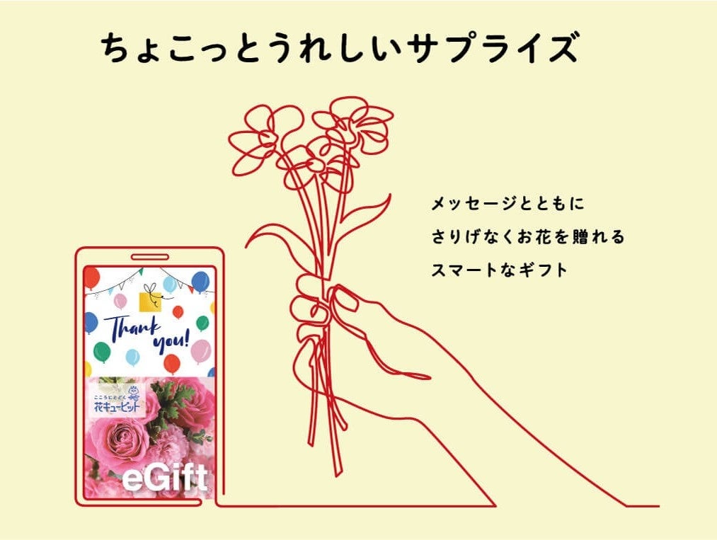 「花とみどりのeギフト」は、全国の花キューピット加盟店(一部店舗を除く)、オンラインストアどちらでも利用できる電子ギフトです。贈り方は簡単で、ギフトカードを選んでメッセージを登録して購入し、メールやLINE、SNSで贈りたい相手に送信するだけ。メッセージと一緒に「お花」をお贈りいただけます。住所がわからない相手にも気軽に花を贈ることができます。