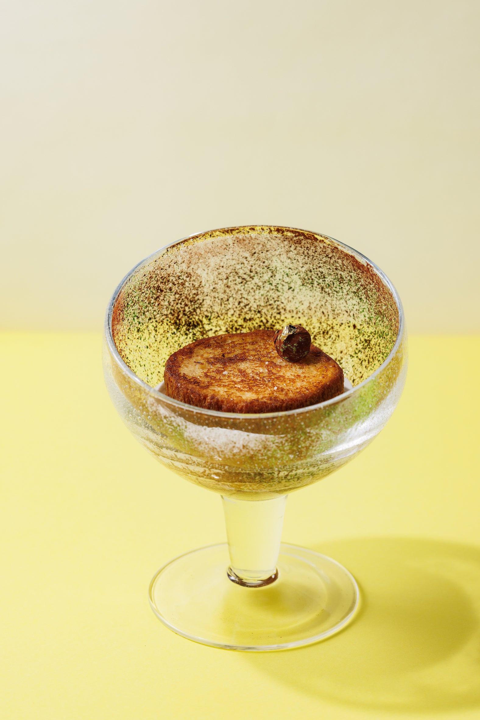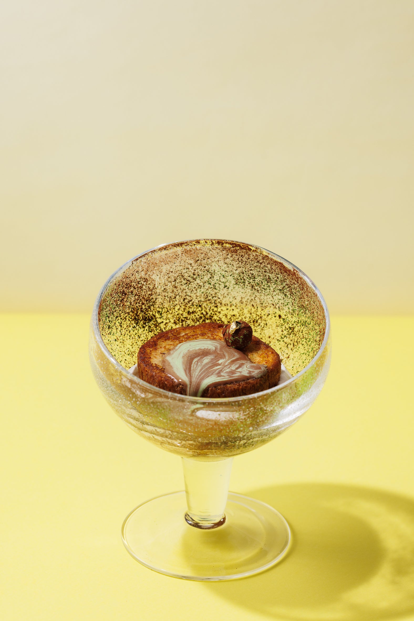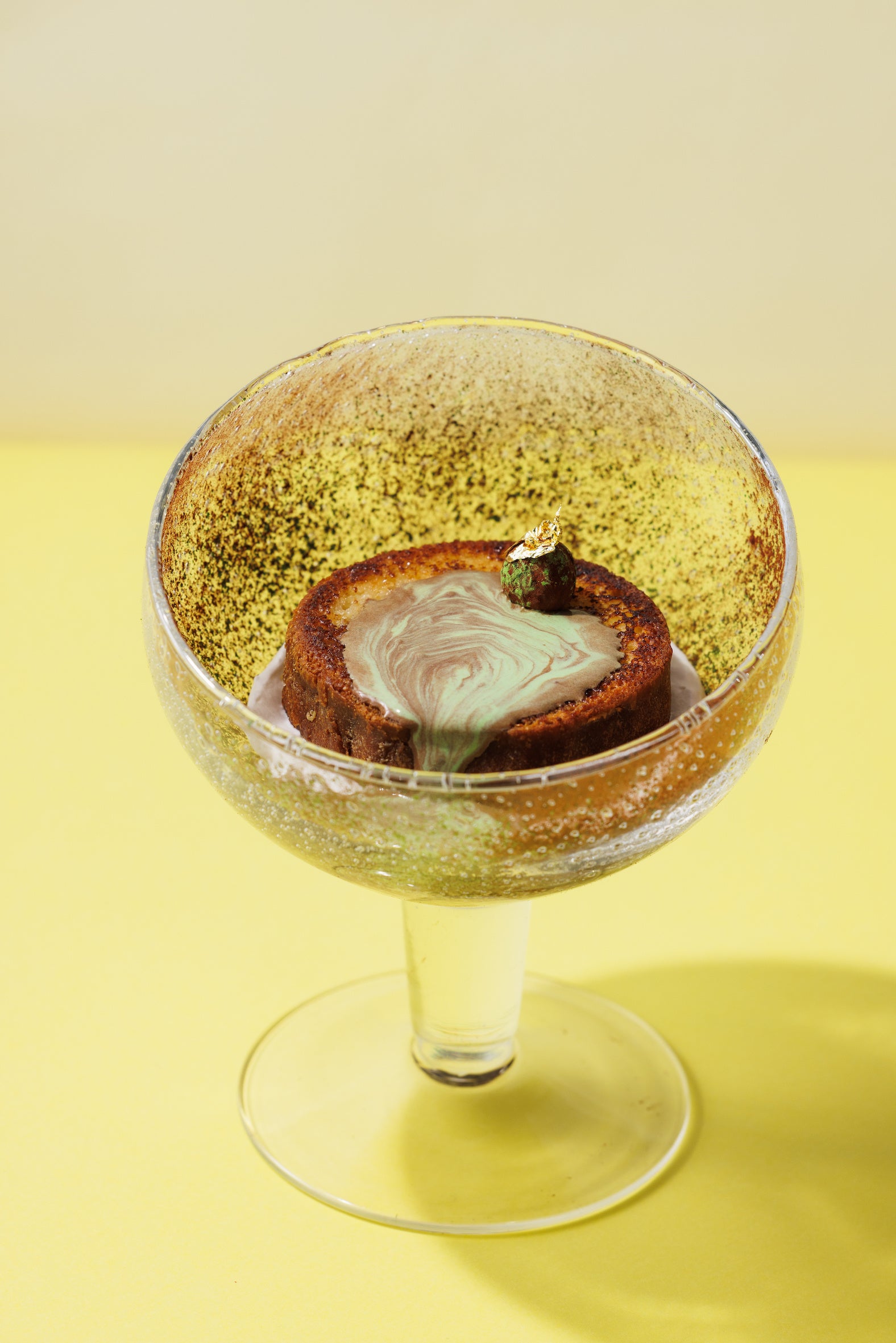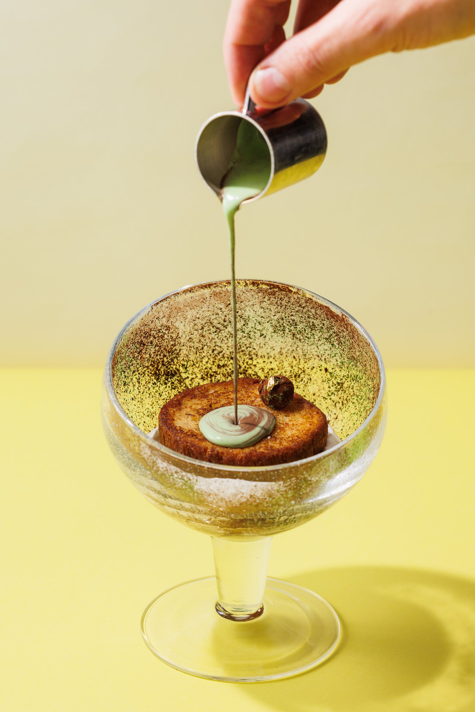 フランス語でフレンチトーストを意味する「パン・ペルデュ」は、昨春より六本木店にて提供している平日限定のデザートです。オリジナルバージョンのショコラから始まり、ピスタチオ、ココナッツに続く第4弾のフレーバーは”ショコラ・マッチャ“。軽やかに泡立てた生クリームに、深い緑と上品な香りの西尾の抹茶とアーモンドのプラリネを重ね、アパレイユにたっぷり浸した自家製ブリオッシュを香ばしくトーストしてのせました。トップに飾った抹茶とアーモンドのトリュフの濃厚なくちどけがアクセント。ショコラと抹茶の温かいソースをかけてお召し上がりいただきます。素材の風味を存分にご堪能いただける、甘さを控えた大人の味わいです。