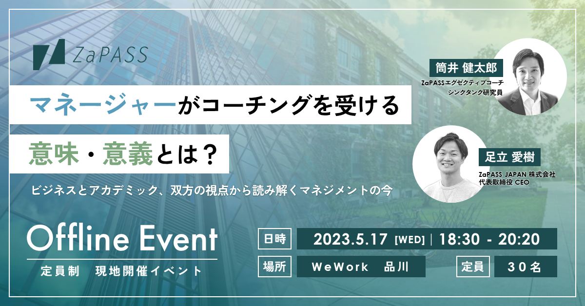 ZaPASS JAPAN 株式会社(本社:東京都千代田区、 代表取締役社長:足立愛樹)は、マネジメントとコーチングに関心がある方向けの無料イベント「マネージャーがコーチングを受ける意味・意義とは?〜ビジネスとアカデミック、双方の視点から読み解くマネジメントの今〜」を、5月17日(水)に WeWork 品川にて開催することをお知らせいたします。