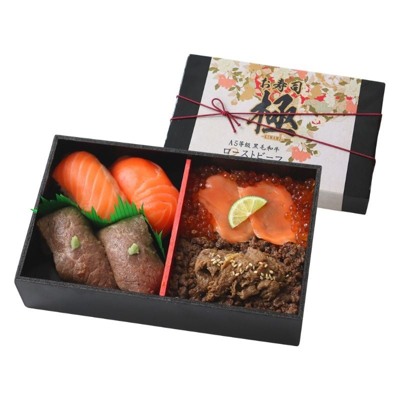 キングサーモンの寿司2個、ローストビーフのお寿司2個、鮭といくらちらし、牛肉しぐれ煮・そぼろちらし