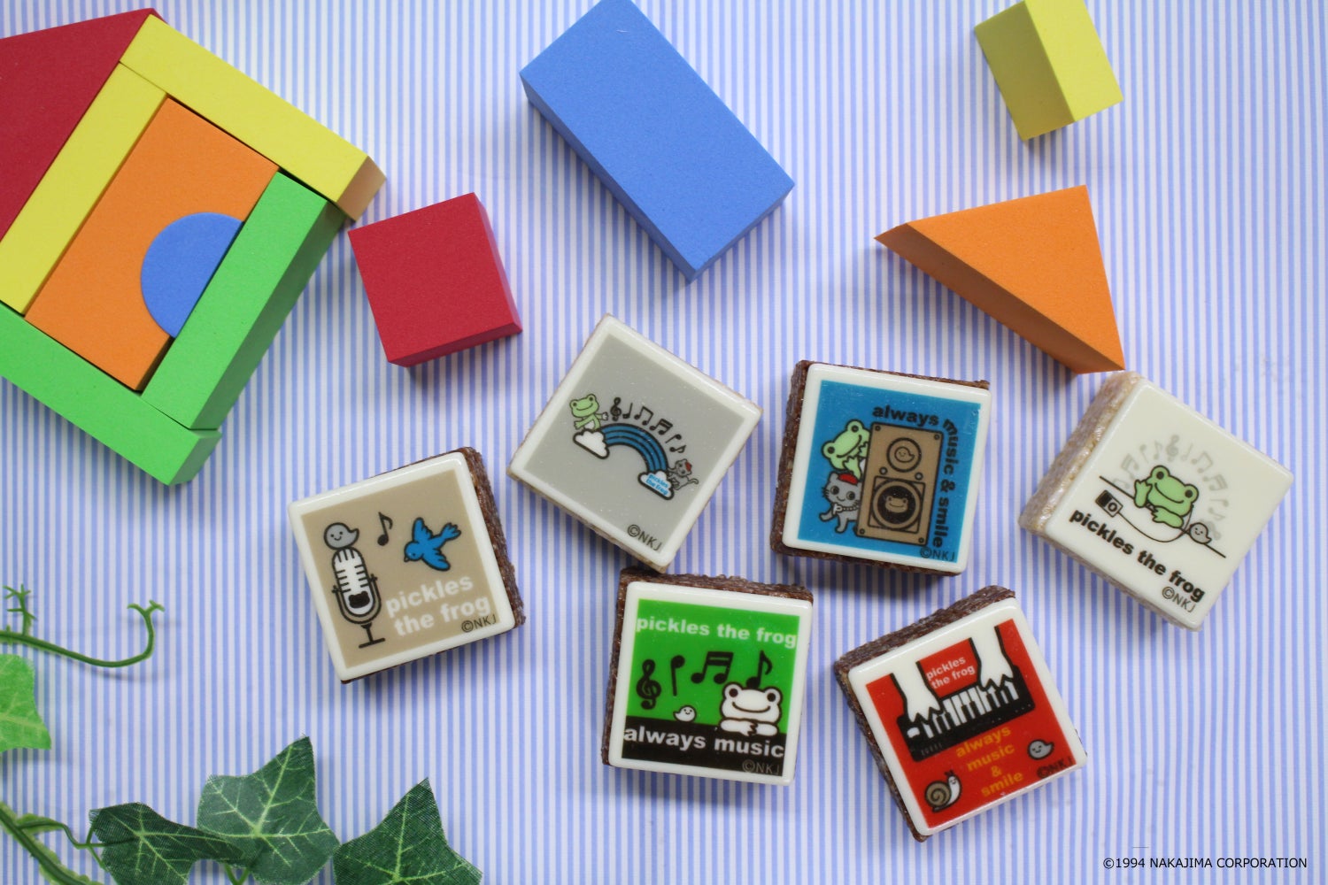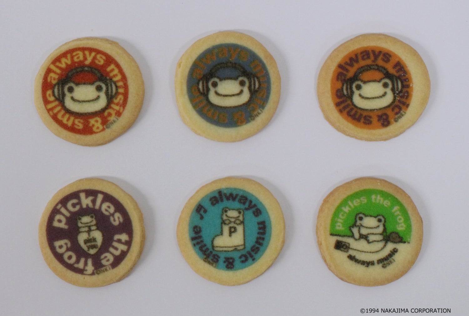 「かえるのピクルスコラボクッキー」はピクルスデザインのシール付きのカップに、6種類のプリントクッキーを詰め合わせました。