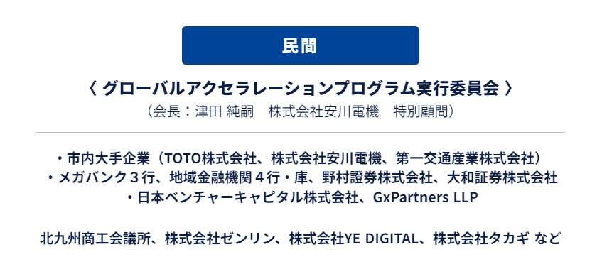 事業規模の拡大が見込まれるスタートアップ企業へ対し専門家による強力な伴走支援を行い、投融資や協業などの支援を行う民間主体のプログラムです。