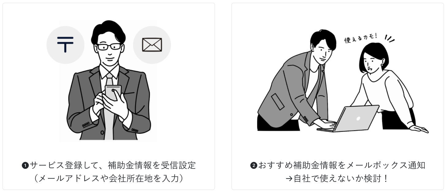 そこで、忙しい中小企業の担当者でも、自社で使えそうな補助金・助成金の新着情報をキャッチアップできるよう、それらをメールで自動受信できるサービスを開発・提供開始するに至りました。