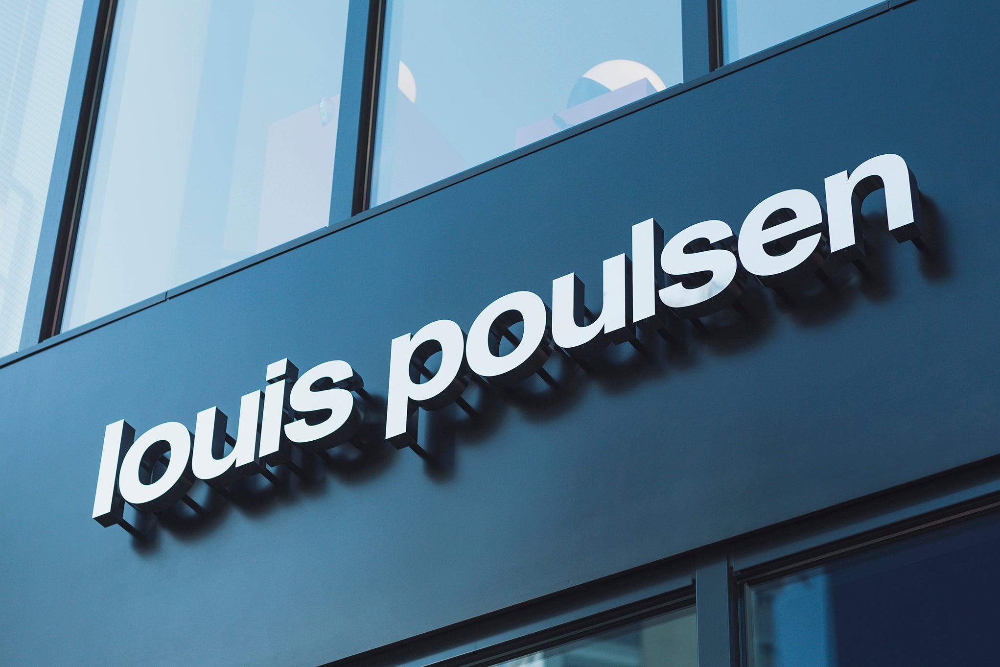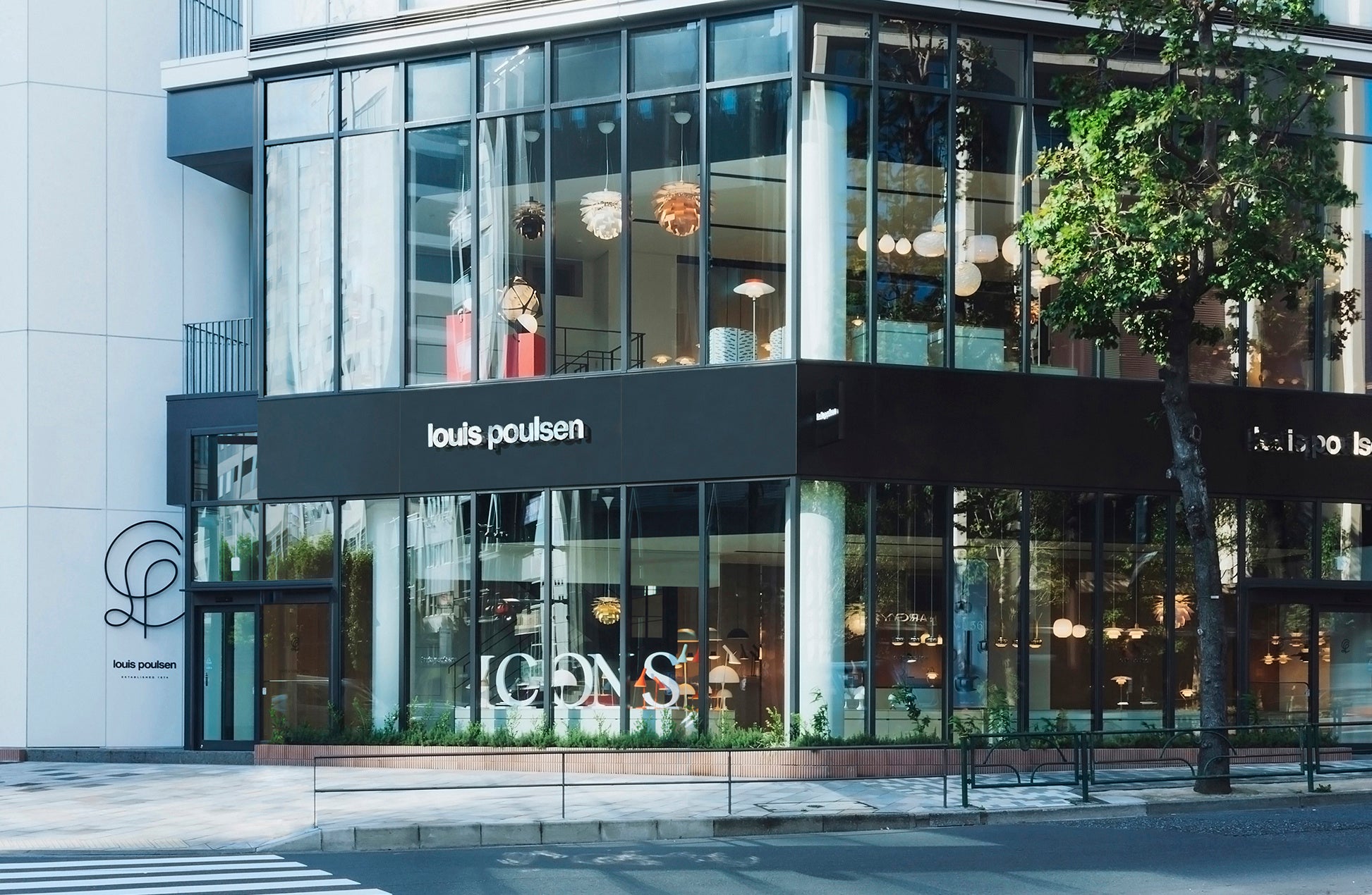 伝統なデザイン、素材、そしてカラーリングからインスピレーションを得たこの店舗は、2023年1月にアップデートされたルイスポールセンの新しいブランド・アイデンティティを反映しています。また、エントランス付近の外壁に新設のロゴマークが飾られています。このロゴマークは、ルイスポールセンのイニシャル「LP」と、ブランドの最も象徴的で革新的なデザインである3枚シェードのランプをエレガントに表現しています。