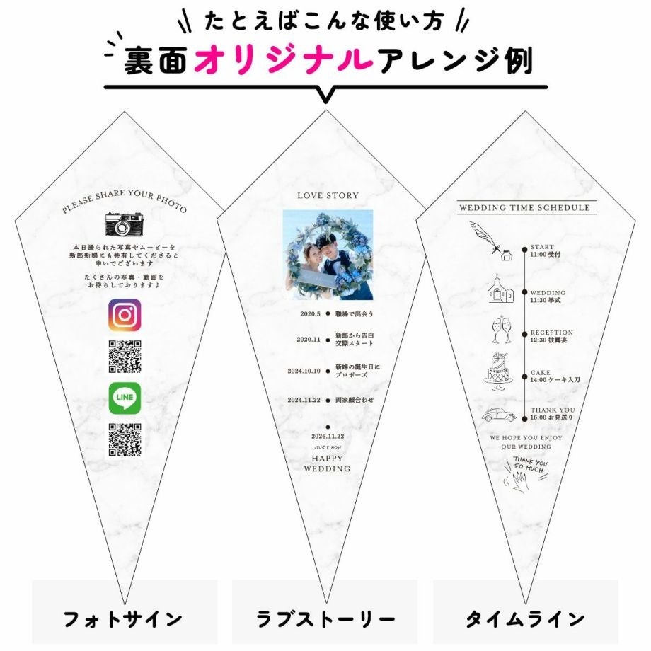 裏面は空白になっているので、手書きメッセージを書くこともできます。オプション(有料)で、写真を共有していただくためのQRコードを入れた「フォトサイン」や、おふたりの歴史を年表化した「ラブストーリー」などを追加していただくことも可能です。