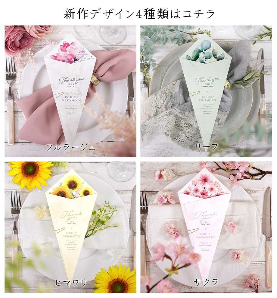 こちら発売以来、ご好評いただいているシリーズなのですが、この度新デザインが4種類加わって、ますますパワーアップ!フラワーショップでお花を選ぶ感覚で、席札選びを楽しんでいただきたいという想いもあります。