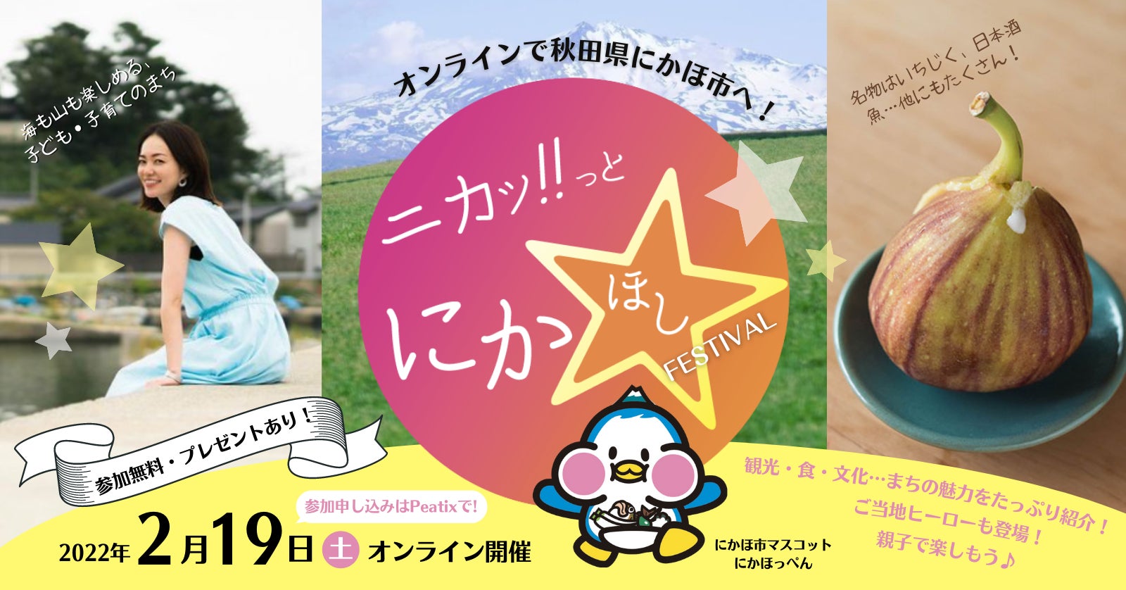 秋田県にかほ市(市長・市川 雄次)は、2022年2月19日(土)にオンラインイベント「ニカッ!っとにかほしフェスティバル」を開催します。ご当地ヒーローによる親子参加型イベント、鳥海山の魅力を紹介するトークセッション、大学生インターンたちが独自に取材・企画したコンテンツなどを予定しており、様々な視点から同市の魅力を発信します。