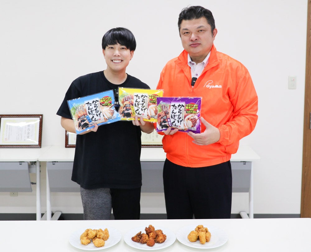 オヤマ常務(小山)のコメント:500日という長い開発期間、試行錯誤を何度も繰り返し、100g中30gという高タンパク配合でしかも美味しい唐揚げが出来上がりました!初めての試みには大変苦労しましたが、気仙沼出身の人気YouTuberオガトレさんとのコラボだからこそ、他の唐揚げにはない高い目標に取り組むことができ、素晴らしい自信作が出来上がりました。この「からあげたんぱっくん」が、地方創生、皆様の健康維持、また日々の美味しい食卓づくりにもお役に立てれば幸いです。是非多くの方々に召しあがっていただきたいと思います!