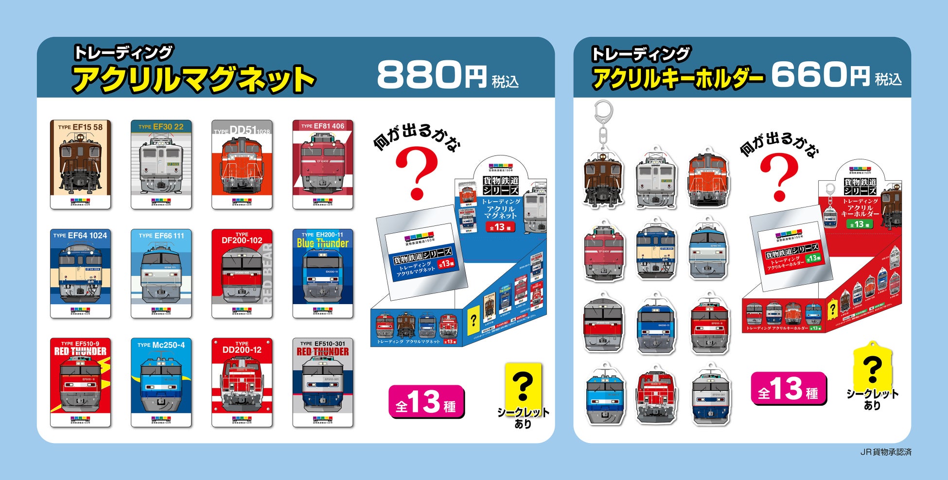 6月に発売されるのは、トレーディング系のアクリルキーホルダー/アクリルスタンド/アクリルマグネット/缶バッジ、加えてA4クリアファイルの5商品。追って7月にはタオルハンカチが発売される。トレーディング系商品は13車両のうち、1車両はシークレットとして用意されているので、何が出るかも気になるところ。
