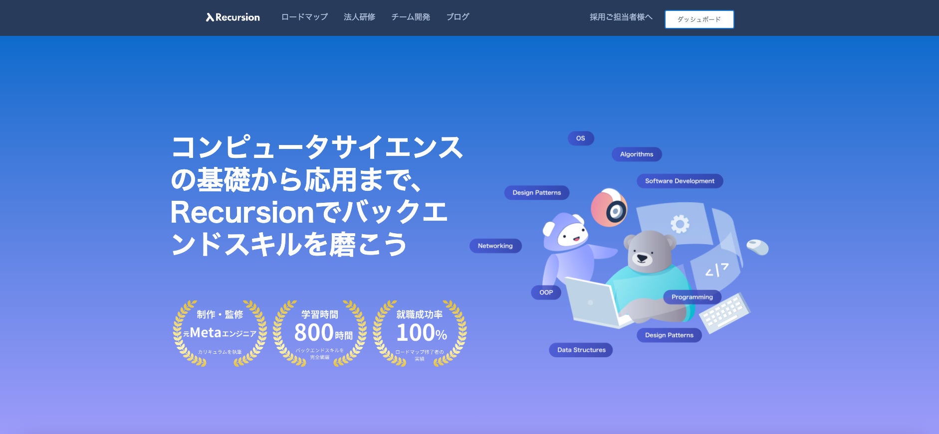 Recursionは、元Metaエンジニアによって設立された、オンラインでコンピュータサイエンスとバックエンド開発を学べるプラットフォームです。アウトプットを中心としたカリキュラム設計により、未経験者から実務レベルの開発力を持つエンジニアへの成長を支援しています。