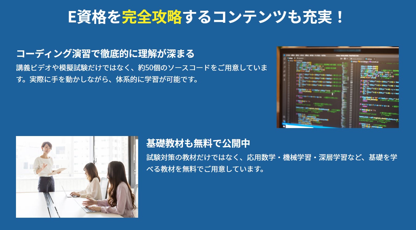 ※補助教材として、講義動画は約41時間、模擬試験は約500問、 サンプルソースコード(機械学習10単元以上、深層学習20単元以上)等のコンテンツを無料で公開しています。