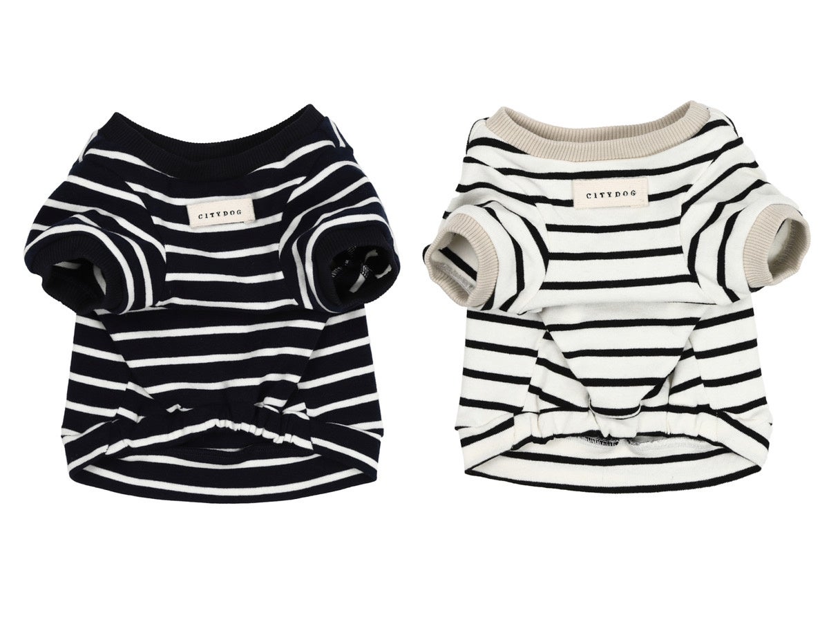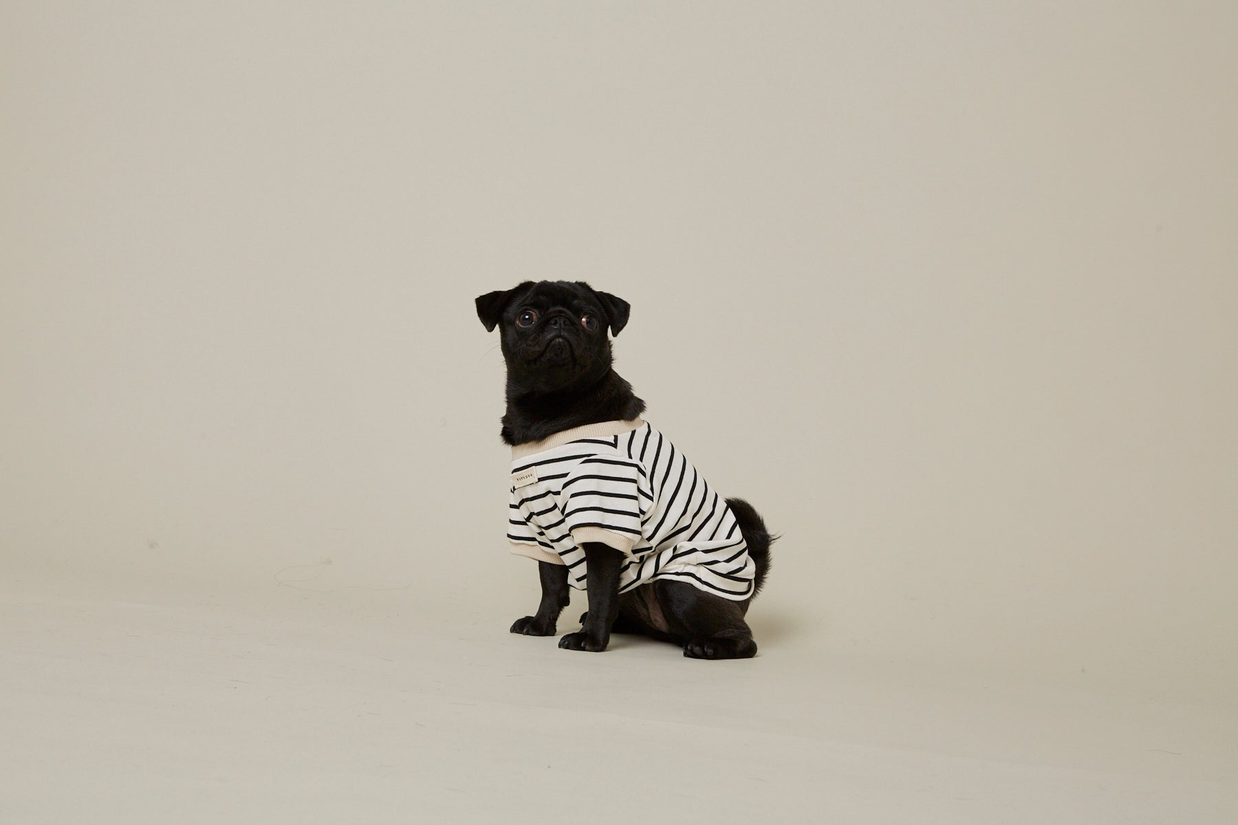 今回発売する「BORDER SWEAT」は裏起毛素材を使用したボーダー生地のウェアです。柔らかく、ぬくもりのある生地なので愛犬のお肌にも優しい素材感です。またゆったりとしたサイズ感のため着脱もしやすく、前見頃の裾にはゴムを入れているため、オス・メス共に着用が可能です。デザインにもこだわっており、上品さと程よいカジュアルさにこだわり、特にホワイトベースはベージュの色味を入れることでバイカラーにし、おしゃれに仕上げました。襟もとと胸元にはブランドのオリジナル刺繍ネームが入っているのも特徴です。お洒落なお部屋着やお出かけ着など、幅広いシーンでお楽しみください。