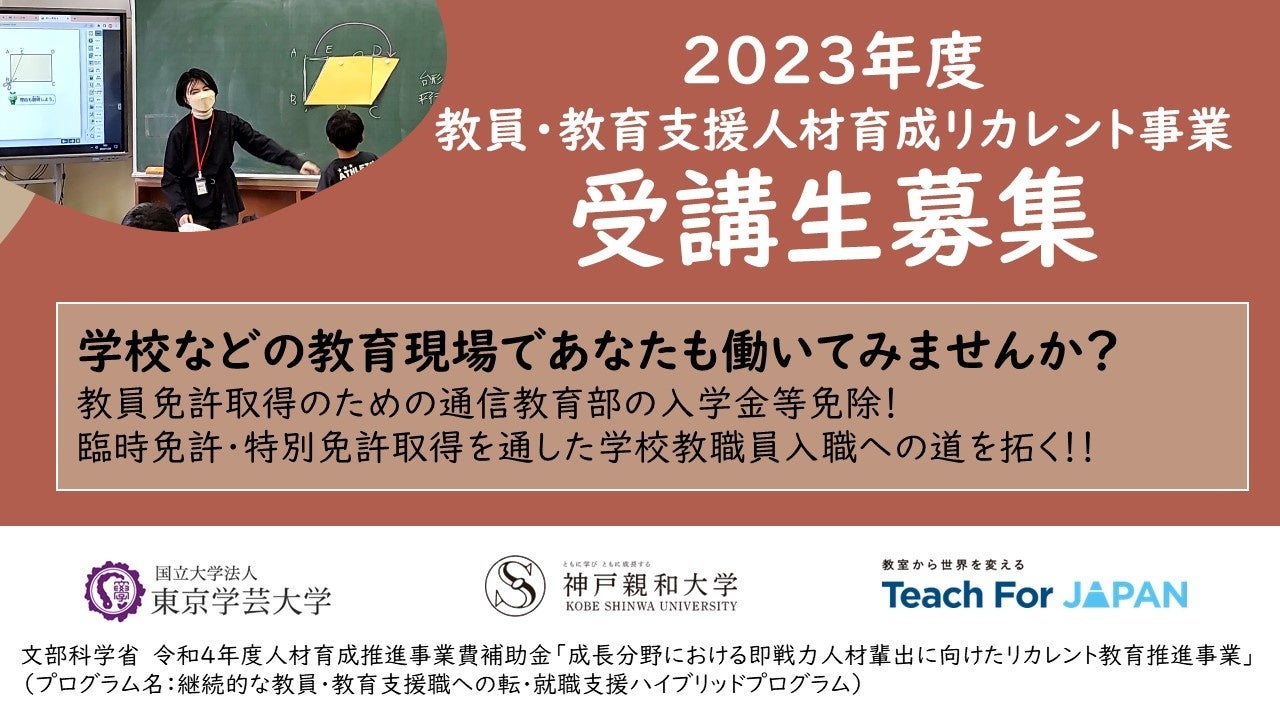 認定NPO法人 Teach for Japanと協働し取り組んできた2021年度および2022年度にリカレントプログラムをベースに、本年度は神戸親和大学との連携により、希望者は神戸親和大学通信教育部への入学金等が免除され、本プログラムの一部科目を教員免許(幼稚園・小学校)取得のために必要な単位として読み替えることができるなど、社会人の教員免許取得を支援し、継続的・持続的に教育人材を輩出するプログラムに発展しています。