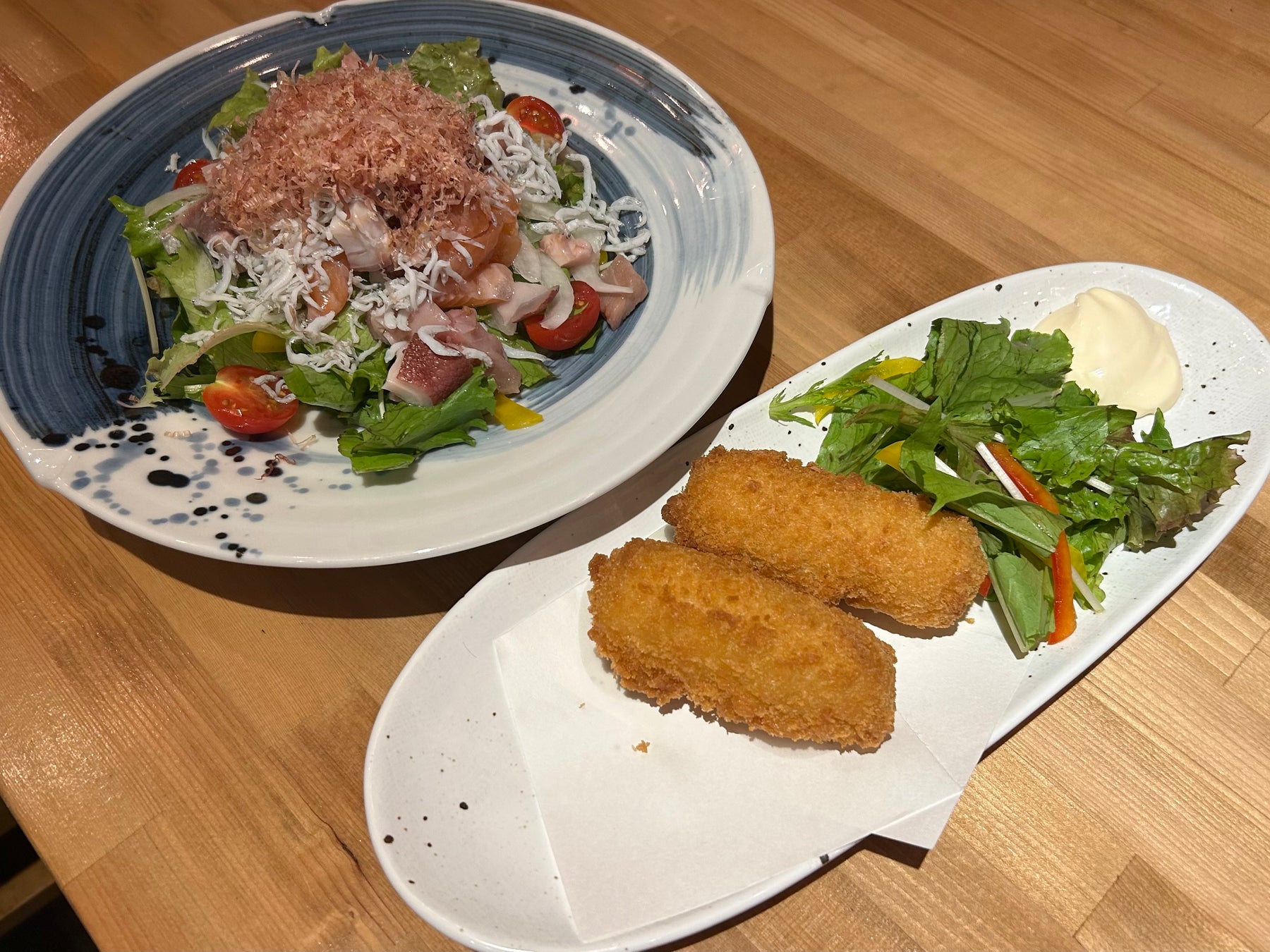 特大ホッケ 1200円 ごちゃまぜ海鮮サラダ 650円 カニクリームコロッケ 650円