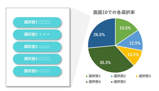 さらに、本サービスの大きな特徴のひとつとして、インタラクティブLP内の詳細データから、高精度かつスピーディーなPDCAが可能な点が挙げられます。LP内の各遷移ページの選択肢にて、何がどのくらい選択されているのか、何を選択したユーザーのCVRが高いのか、離脱しているユーザーが多いのはどこか等をデータで確認することができ、これらのデータを元に分析し仮説を立てて施策を講じる、というLP内のPDCAサイクルをスピーディーに回すことで、短期間で飛躍的なパフォーマンスの改善を精度高く実現することができます。