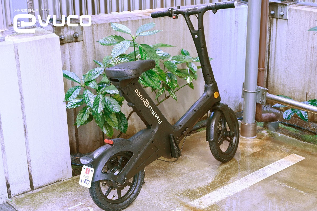 現在流通している多くのフル電動自転車が雨や粉塵に弱いなか、『evuco』はパーツ間の継ぎ目をなくし、密度の高い材質を使用することで、IP65(※)相当の防水性能を実現し屋外保管にも対応している。
