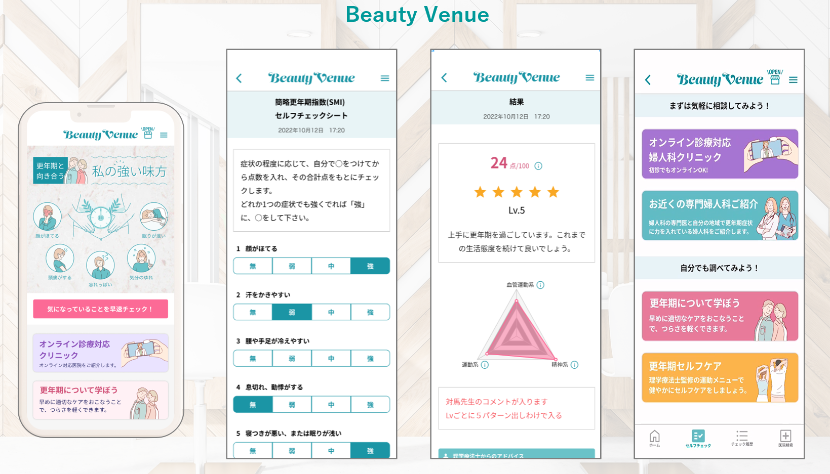 日本美容創生(JBIRC)は昨年8月にものづくり補助金(デジタル枠)の採択をうけアプリのVer.2を開発中です。Ver.2では婦人科で使用する簡略化更年期指数カウンセリングシート(=SMI)をアプリ”Beauty Venue”に実装し一般女性ユーザーが更年期症状の進行をセルフチェックできます。更年期症状は女性ホルモンが急激に減少することで発症するため、減少したホルモンを補充することで症状を和らげる「ホルモン補充療法」が婦人科で処方されます。Ver.2では更年期症状をオンライン診療で対応できる婦人科を紹介する機能が実装され、将来的にはオンライン診療システムの内製化、また医療用医薬品の販売を目指します。