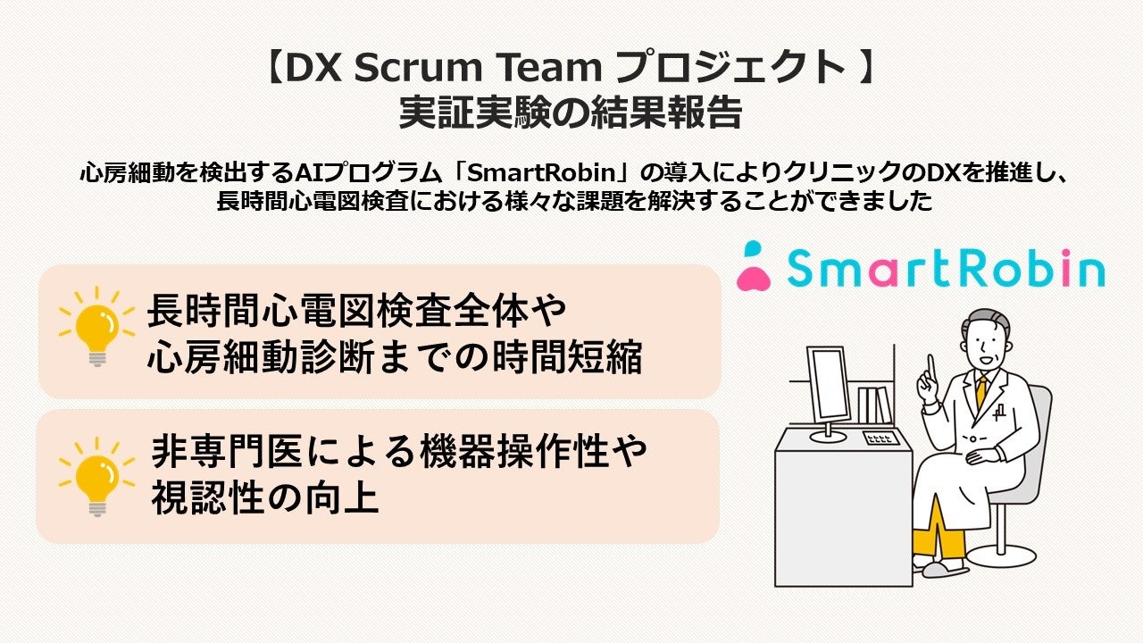 株式会社カルディオインテリジェンス(本社:東京都港区、代表取締役:田村雄一 以下、当社)は、東京都が実施する中小企業DX推進に係るスタートアップ支援事業『DX Scrum Team プロジェクト』*1において当社の事業が採択され、2023年8月より約半年に渡って都内のクリニック2施設にて実証実験を実施しました。当社製品である心房細動を検出するAIプログラム「長時間心電図解析ソフトウェア SmartRobin AI シリーズ」(以下、SmartRobin)*2を導入いただくことで、長時間心電図検査にかかる医療従事者の業務効率化を実現することができました。
