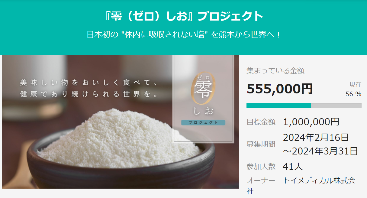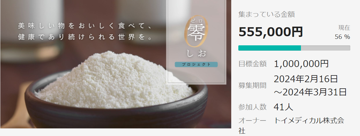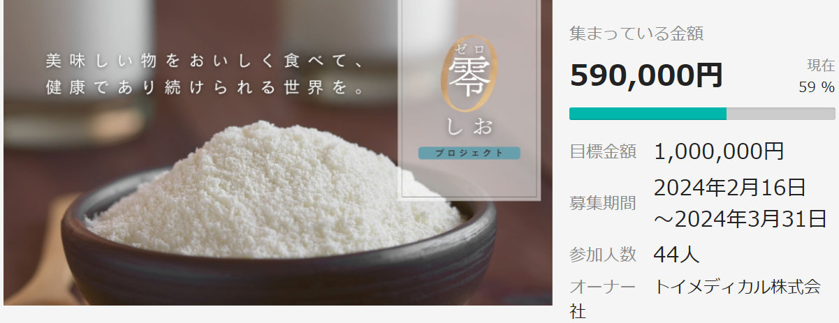 『減塩に悩むすべての人へ。』クラウドファンディング590,000円達成!零(ゼロ)しおプロジェクト支援者を募集中