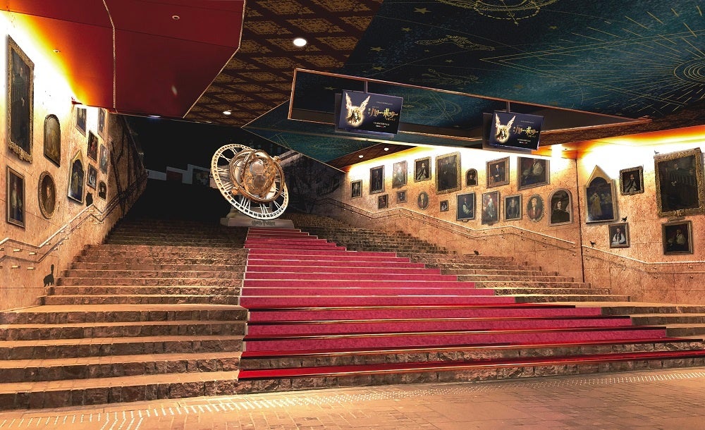 赤坂駅構内からハリー・ポッター魔法ワールドエリアへの“玄関”となるこの場所では、劇中にも描かれるホグワーツの動く階段をイメージした装飾が展開され、象徴的なオブジェであるタイムターナー(逆転時計)が配置されます。このタイムターナーによって、ここから始まる赤坂サカスで過ごす楽しい時間へ「時を転換させる」というのがこの空間のテーマです。天井の星空や壁の美しいアートワークにもご注目ください。