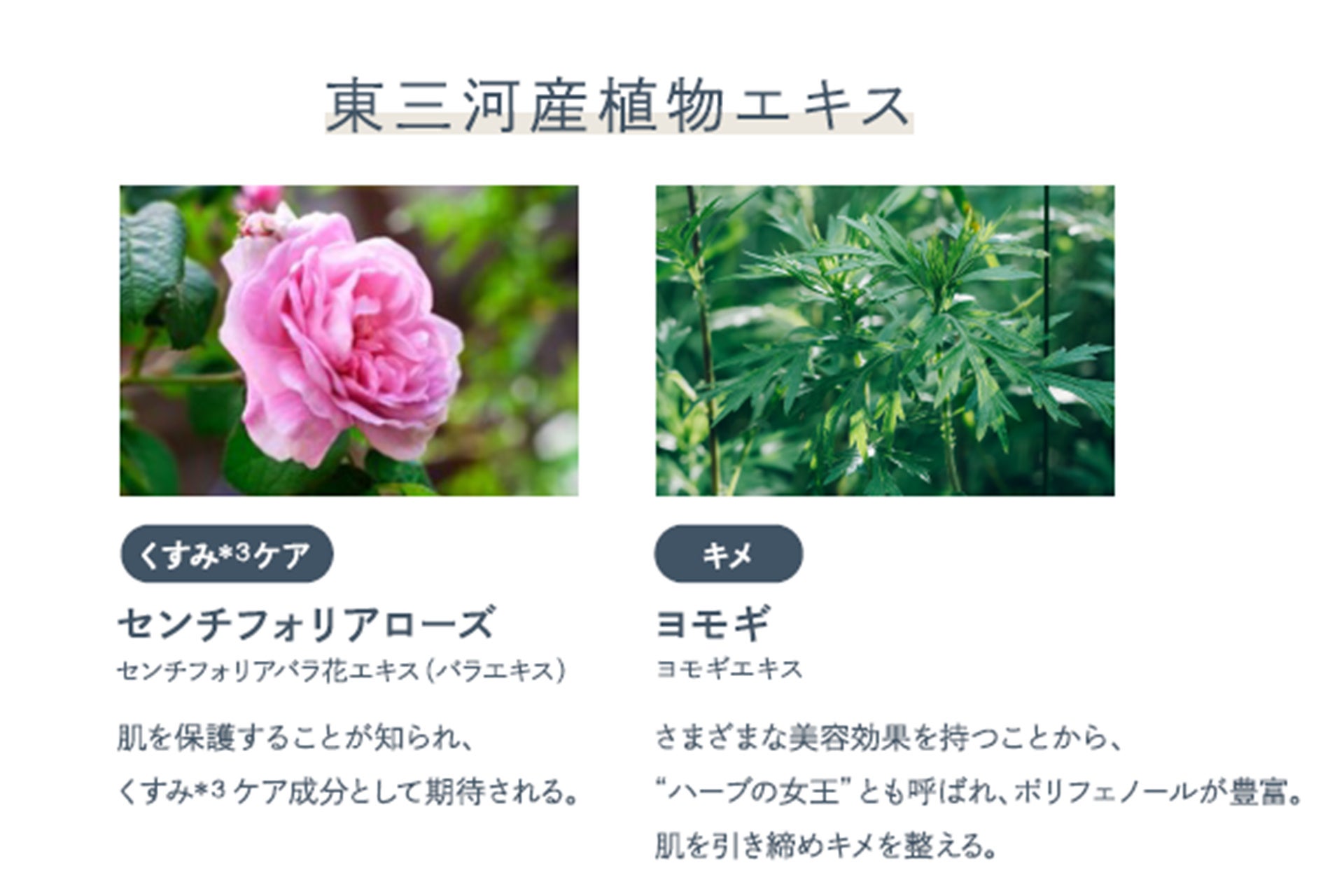 「W有効成分*²×東三河産の植物エキス」を配合し、くすみ*³や肌荒れまで多角的にケアします。