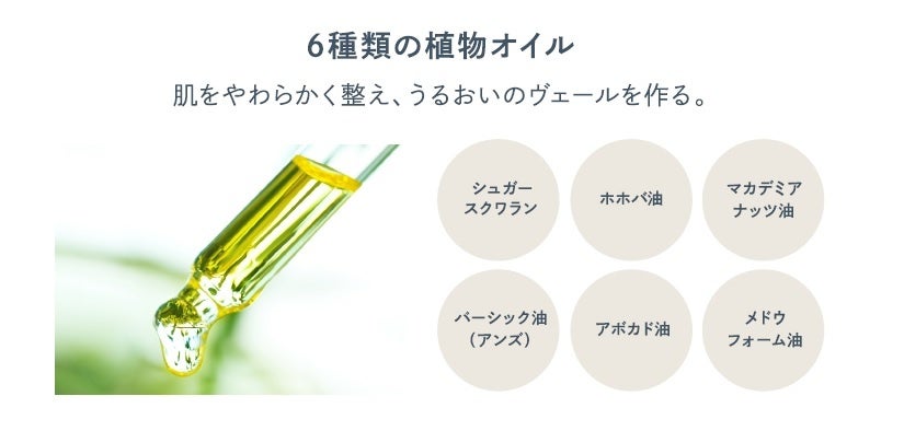 シュガースクワラン、ホホバ油、マカデミアナッツ油、パーシック油(アンズ)、アボカド油、メドウフォーム油