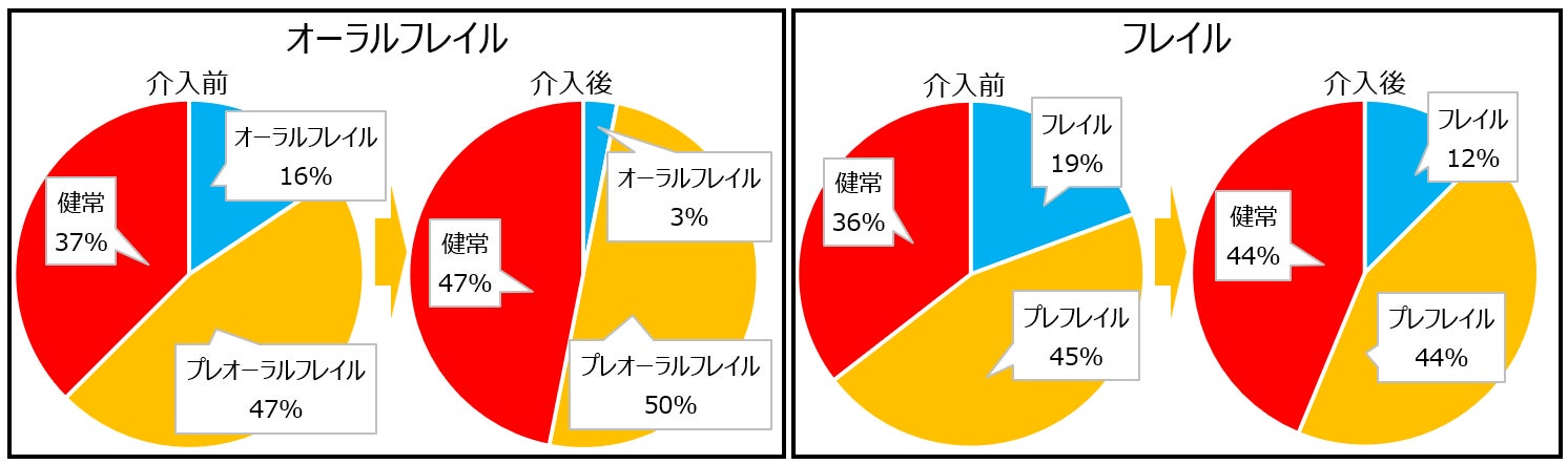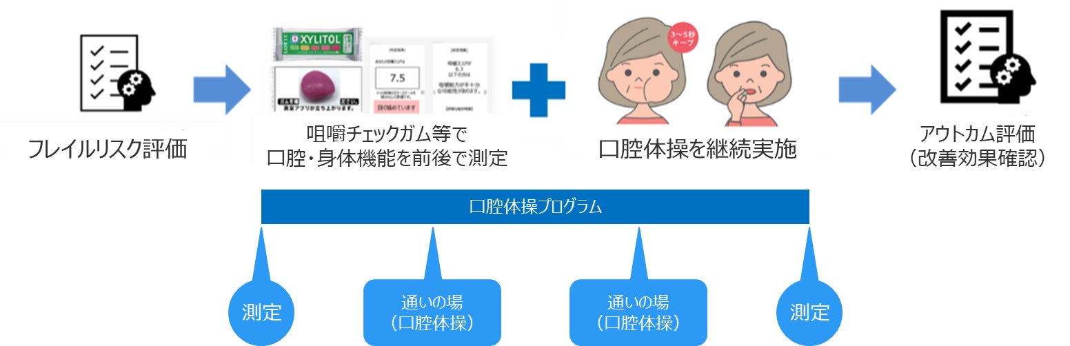 フレイルは、加齢とともに心身の機能が低下し、介護が必要になりやすい虚弱な状態を指し、健康と要介護の中間地点です。放置すると要介護状態のリスクが高まることから超高齢社会における喫緊の課題とされ、あいちデジタルヘルスプロジェクトにおいても取組の柱の一つとされています。早期の段階で把握し適切な介入を行うことが重要であり、エーザイのフレイルリスク予測サービス*を起点とし、ロッテの予防介入プログラムによる効果検証を実施しました。後述する事業において実施した約3か月間の口腔体操プログラムを通じ、オーラルフレイル(お口の衰え)およびフレイルの改善を確認しました。