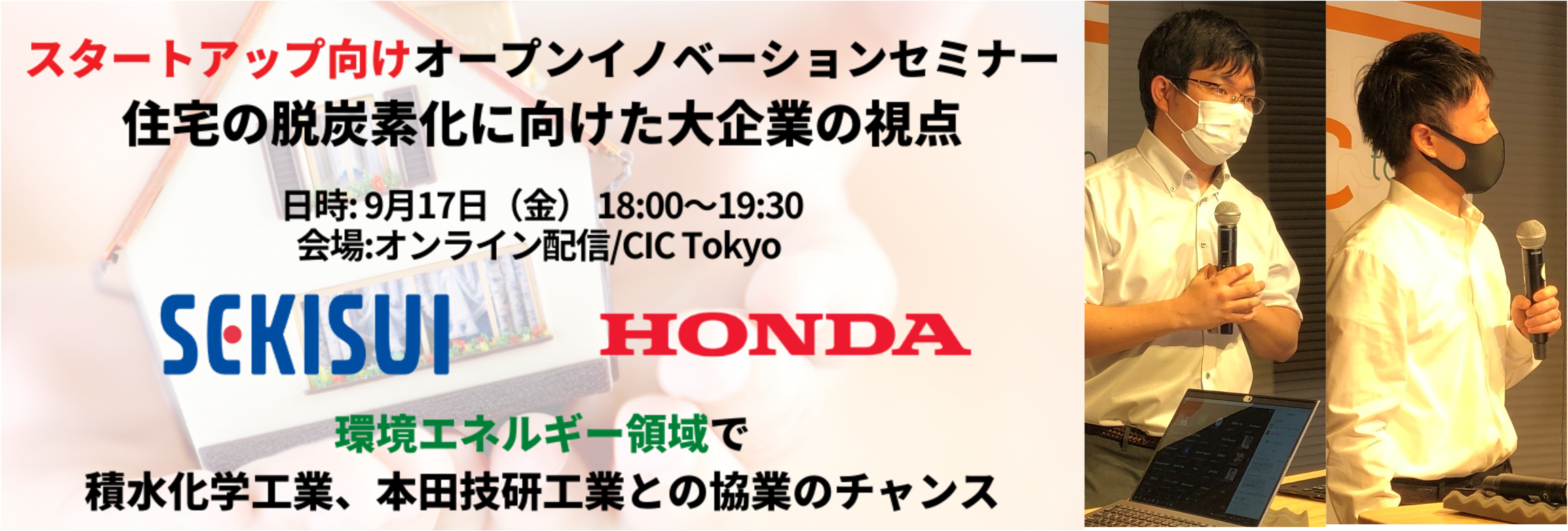 事業会社からの課題提示イベントである”スタートアップ向けオープンイノベーションセミナー 住宅の脱炭素化に向けた事業会社の視点”では、150人を超える登録があり、多くの来場者/視聴者に向けてIssue 1のテーマオーナーである積水化学工業株式会社と本田技研工業株式会社の2社が住宅の脱炭素化に関わる自社の取り組みや期待する技術領域について発表を行いました。