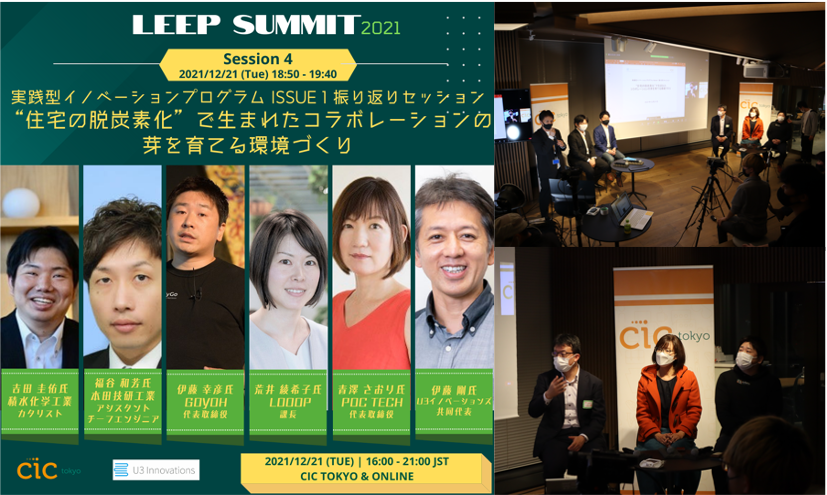 2021年末に行われ700人超が参加登録を行った、環境エネルギーイノベーションコミュニティのシンポジウムであるLEEP Summitにおいて中間報告を行いました。このセッションでは、Issue 1のテーマオーナーである積水化学工業株式会社及び 本田技研工業株式会社に加え、参画したスタートアップである株式会社GOYOH、株式会社Looop、PoC TECH株式会社から、実践型イノベーションプログラムに参加した効果や意義、そして今後の取り組みについてディスカッションを行いました。