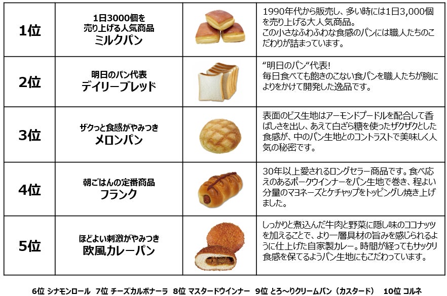 1位2位は不動のミルクパン、デイリーブレッド。そこに毎月トップ10には入っていた「欧風カレーパン」がついにトップ5にランクインしました。寒い時期についつい食べたくなる欧風カレーパンは自家製カレーとサックリ食感にこだわりがあります。