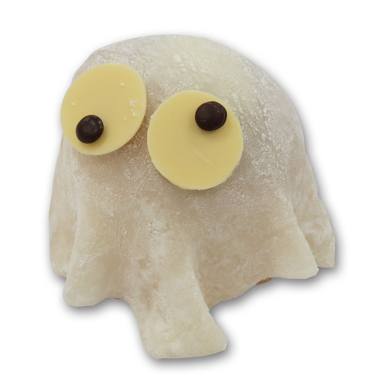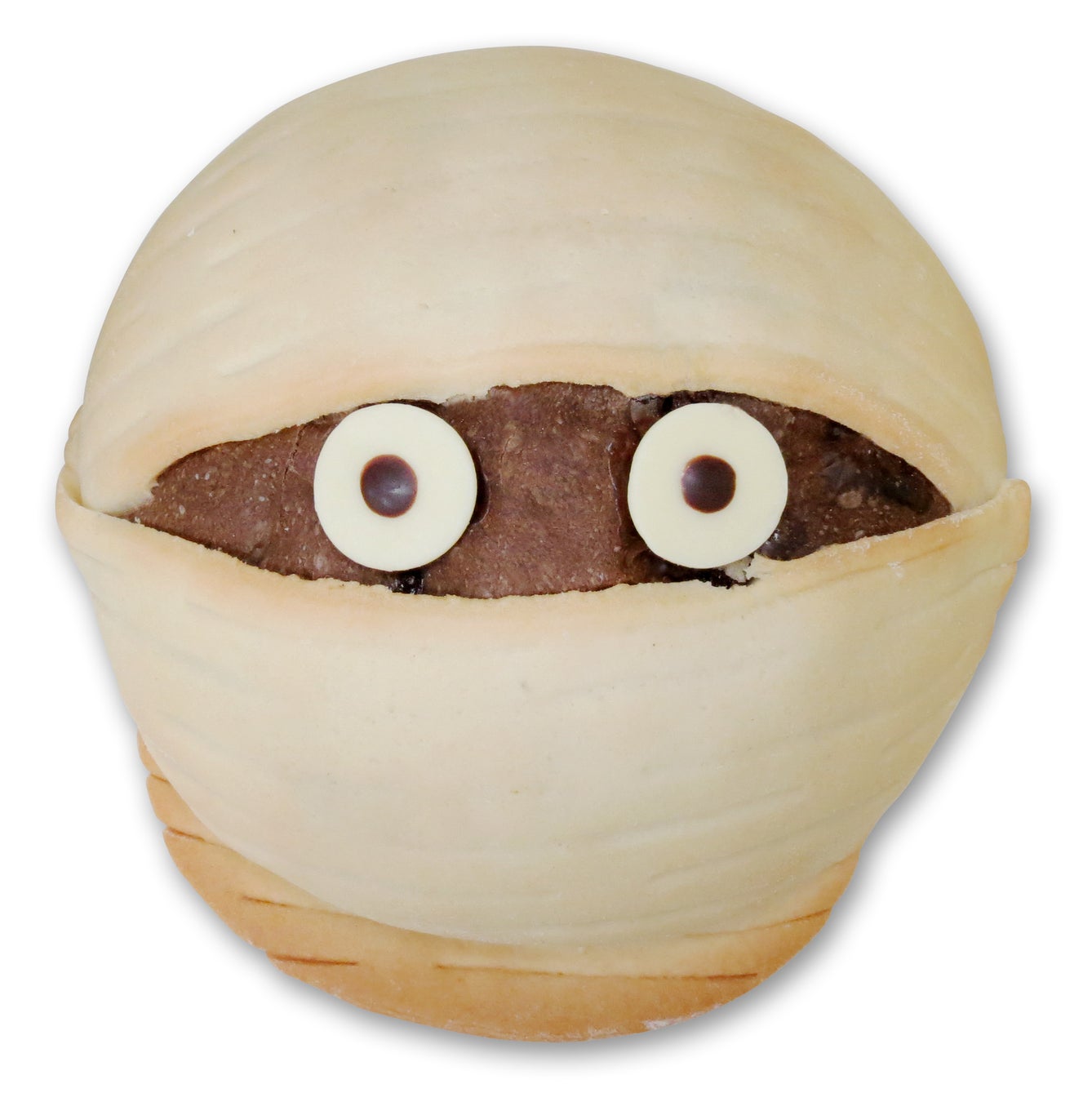 チョコチップ入りのココアパンに白いビス生地を乗せました。目の部分の幅と包帯の筋など細部にまでこだわった逸品です。
