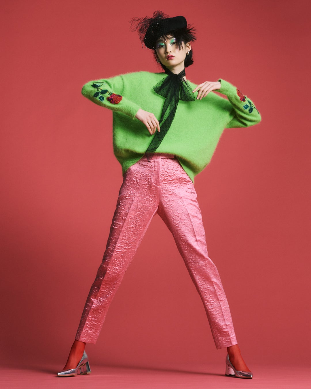 やわらかなアンゴラウールのプルオーバーは、鮮やかなニット地に1本の薔薇モチーフを両袖にアップリケであしらいました。布やさまざまな質感の糸、ビーズなどをふんだんに用いることで、薔薇のもつ美しさが繊細に表現され、まるでアートを纏う気分に。いつでも視界に花が目に入る配置にも注目です。