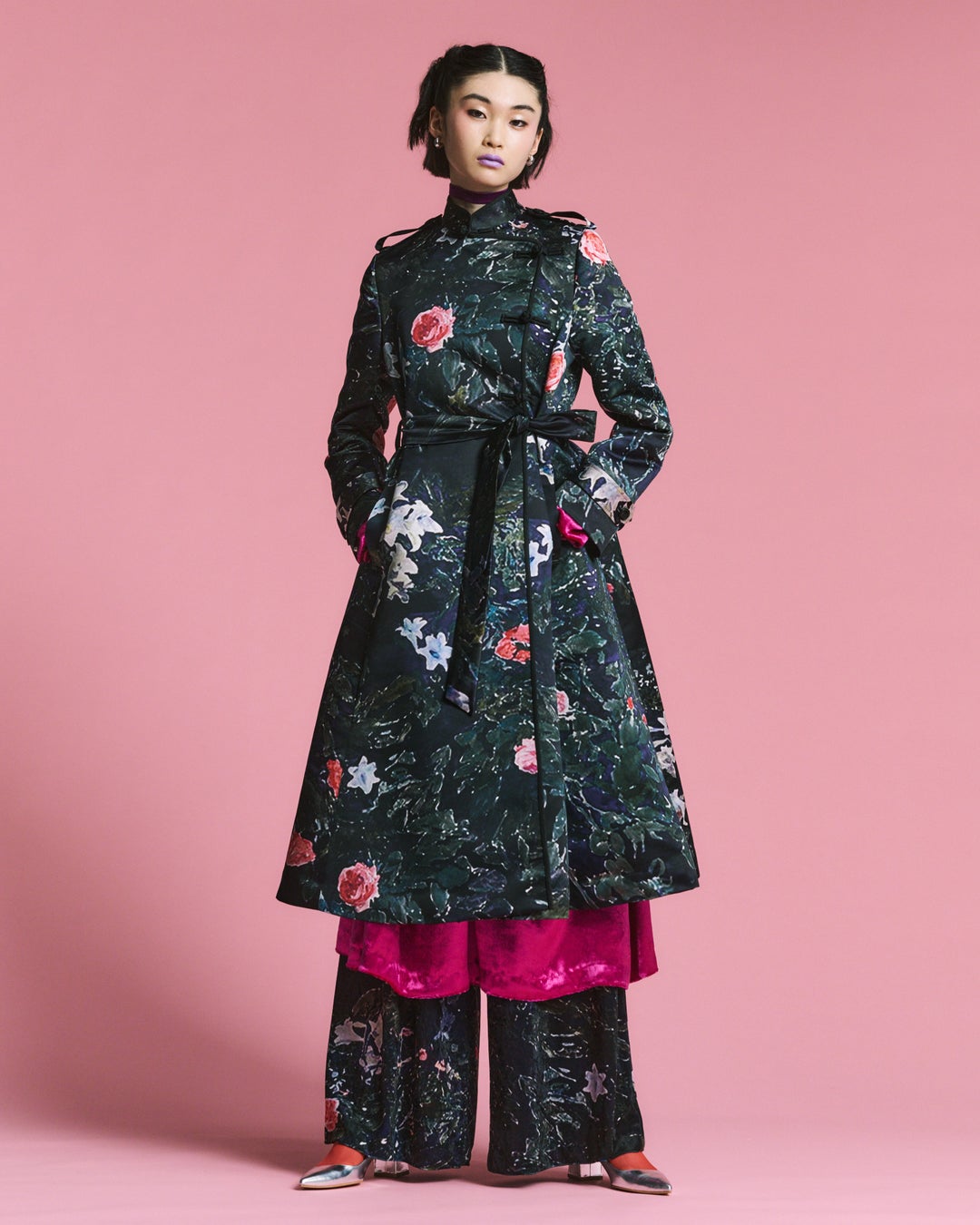 今期のメインプリントは、画家・守山友一朗さんのアートシリーズ第二弾。深夜の公園にミステリアスに咲き誇る薔薇や百合を描いた油絵作品「Rose & lilies at night」をシルク/サテン/ベロアにプリントしています。このプリント地を贅沢に使ったライトコートは、エポレットやヨーク、ウエストベルトなどトレンチコートのディテールを多く取り入れトラッドなムードに。さらにネックラインからフロントにかけては人気のチャイナディテールでKEITA MARUYAMAらしいアレンジを加えています。定番のタッセル付きのパンツは、ゆったりしたシルエットでリラックスして着られ、華やぎも漂わせる1枚です。