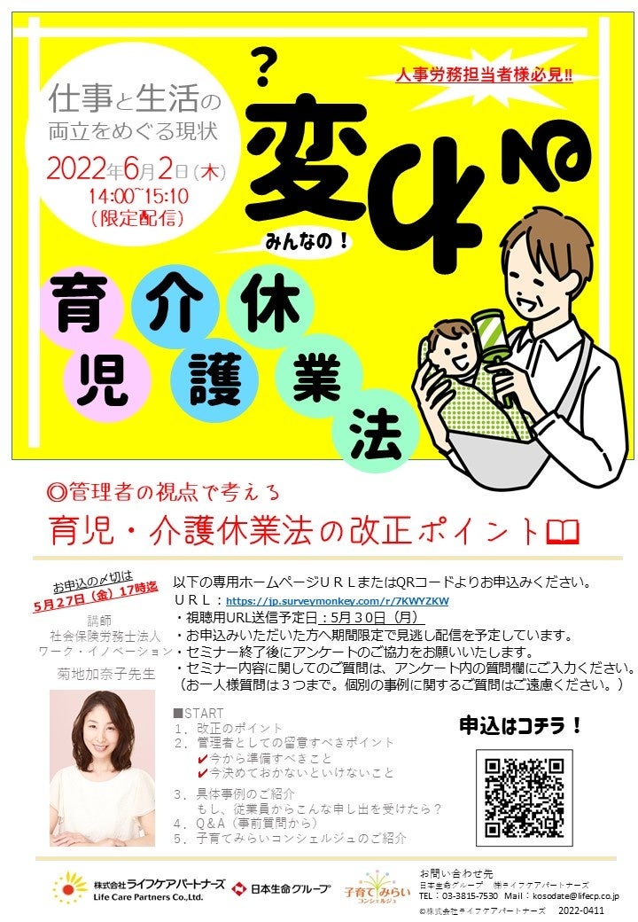 株式会社ライフケアパートナーズ(社長:矢野美佳、以下「当社」)は、「子育てと仕事の両立」を多くの人が考え、支える環境づくりの支援を行っております。このたび、人事労務のご担当者様向けオンラインセミナー「管理職の視点で考える 育児・介護休業法の改正ポイント」(無料)を開催します。ぜひご参加ください。