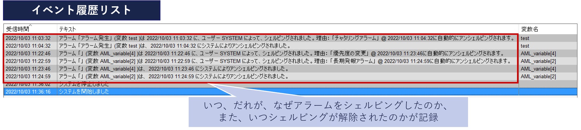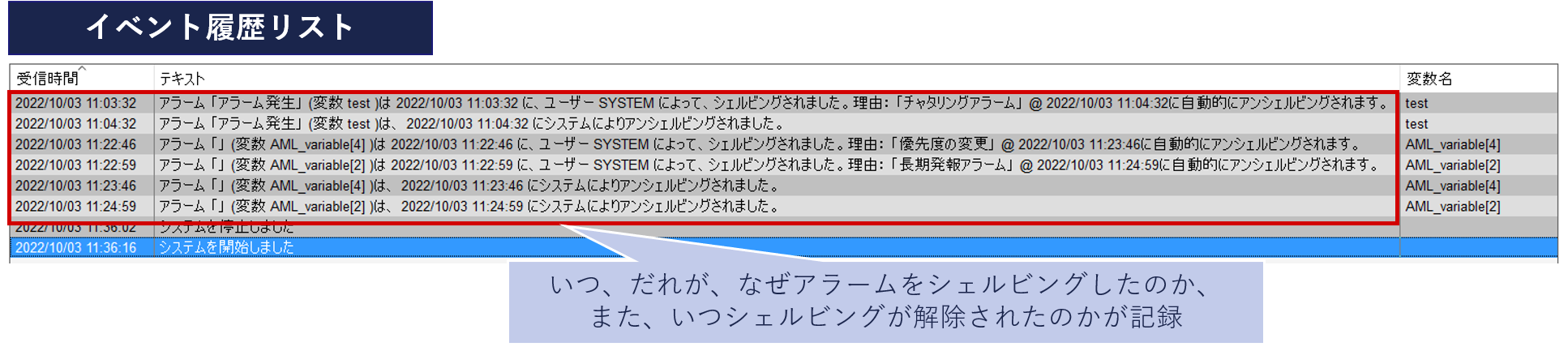 アラームのシェルビングの際にはその理由と期間を設定することができ、その内容はイベント履歴リストにすべて記録されます。