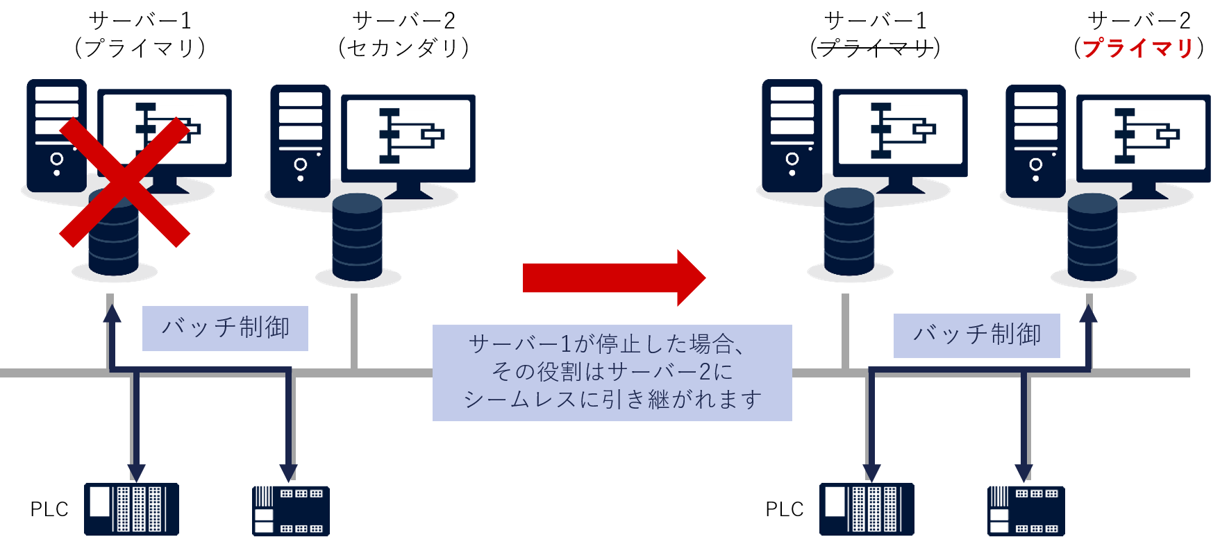 zenon11では、バッチ制御機能のユーザービリティが強化されました。また、バッチ制御の冗長化機能もサポートされ、サーバーPCが壊れた場合においてもスタンバイPCにて制御を継続することが可能になりました。