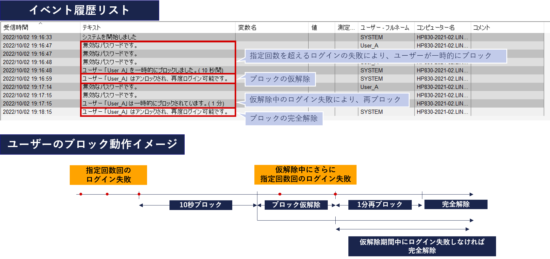 ユーザーがパスワードを間違えて複数回ログインに失敗した際に、そのユーザーを一時的にブロックすることができるようになりました。また、ユーザーのブロック期間終了後に仮ブロック解除期間を設けることができ、その期間中にさらに複数回のログイン失敗が発生すると、一度目のブロックとは異なる期間で、改めてユーザーをブロックすることが可能です。この一度目と二度目のログイン失敗回数およびブロックする期間の長さについては、任意に指定することが可能です。