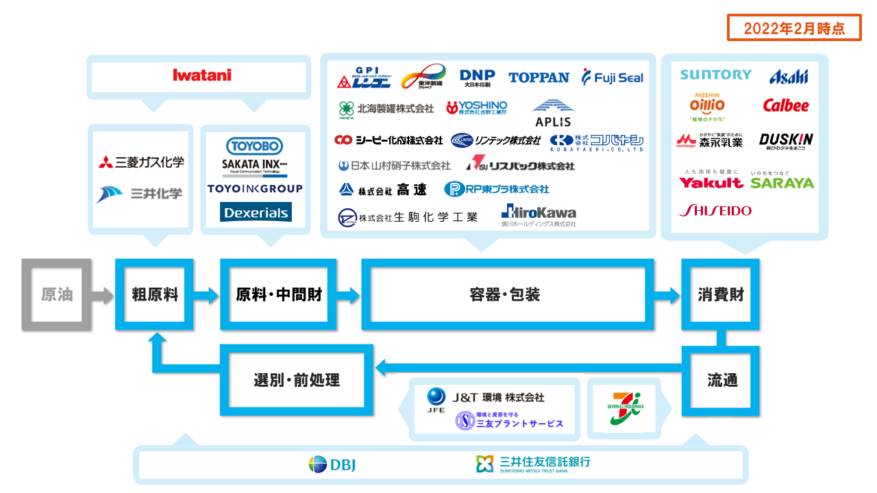 当社が参画する株式会社アールプラスジャパンは、米国のバイオ化学ベンチャー企業であるアネロテック社(Anellotech Inc.)とともに、環境負荷の少ない効率的な使用済みプラスチックの再資源化技術開発を進めます。世界で共通となっているプラスチック課題解決に貢献すべく、回収プラスチックの選別処理、モノマー製造、ポリマー製造、包装容器製造、商社、飲料・食品メーカーなど業界を超えた連携により、2027年の実用化を目指していきます。