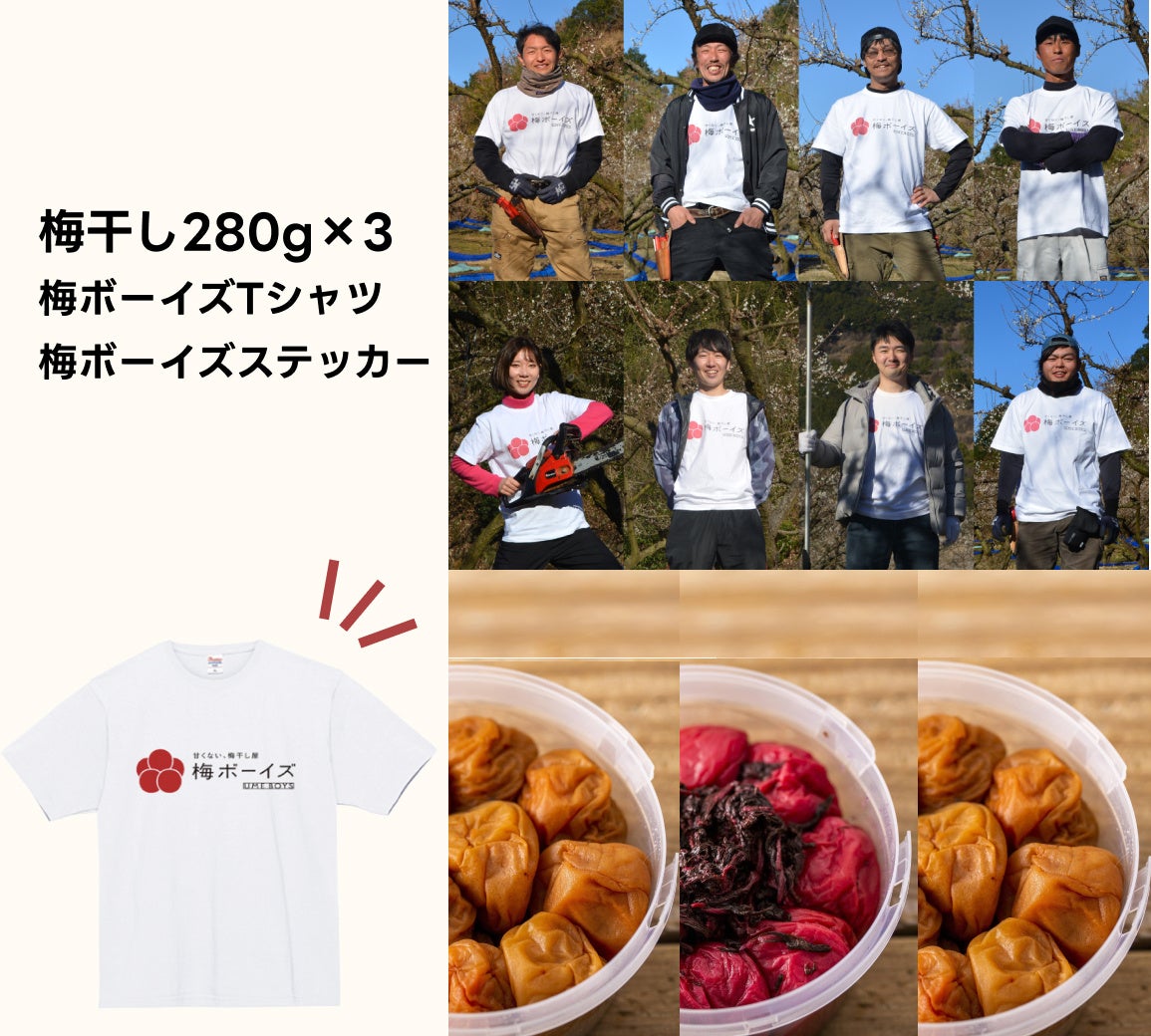 塩だけ、または塩と紫蘇だけの梅干しと、梅ボーイズメンバーとお揃いのロゴ入りTシャツ(サイズはS,M,L)、梅ボーイズステッカーをお届けします。