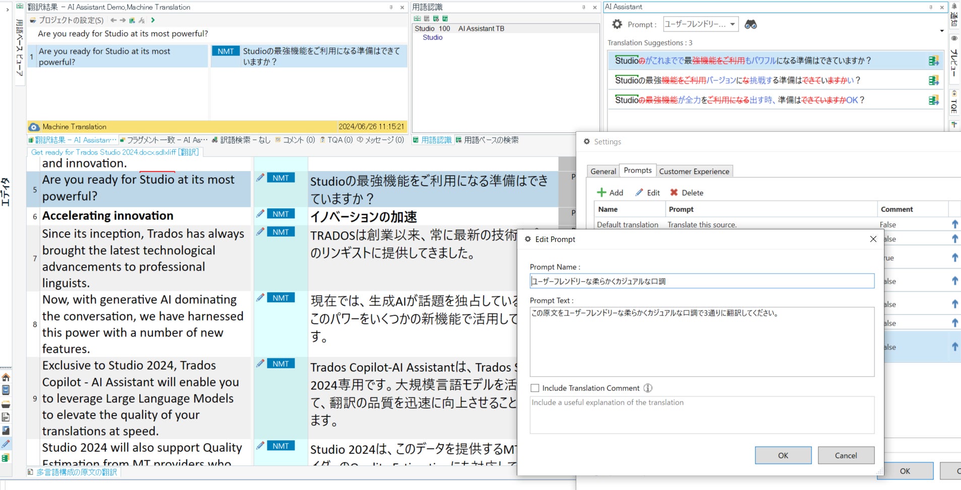 LLMを翻訳プロバイダとして使用し、プロンプトで指示を出すことで適切な表現の訳文を得ることができます。プロンプトは細かく設定・制御でき、日本語でも指示出しが可能です。また登録された用語を使用するよう指示を出すこともでき、レビューにかかる時間を削減できます。
