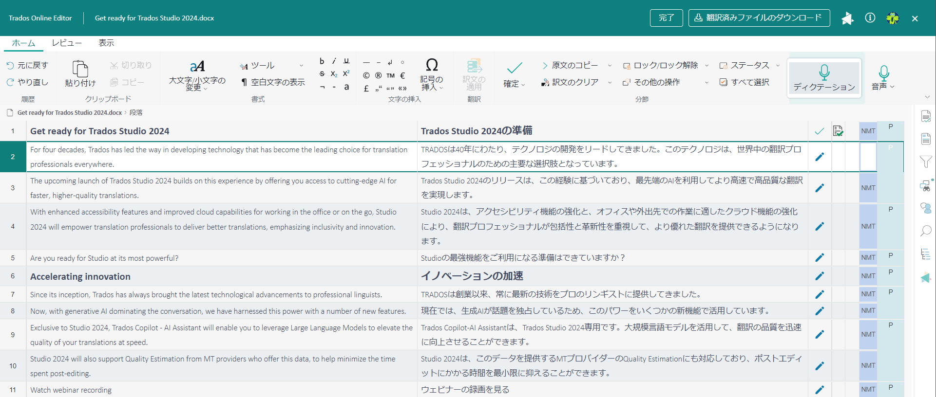 Tradosはすべてのユーザーが使いやすく、より包括的な翻訳環境を目指してデザインされています。Trados Studio 2024では新たにスクリーンリーダーが搭載され、特に視覚障がいのある方でも翻訳の一連の操作を行えるよう改善されています。またオンラインエディタでは音声入力機能が標準搭載され、音声による翻訳の入力と音声によるコマンドの実行が可能となります。