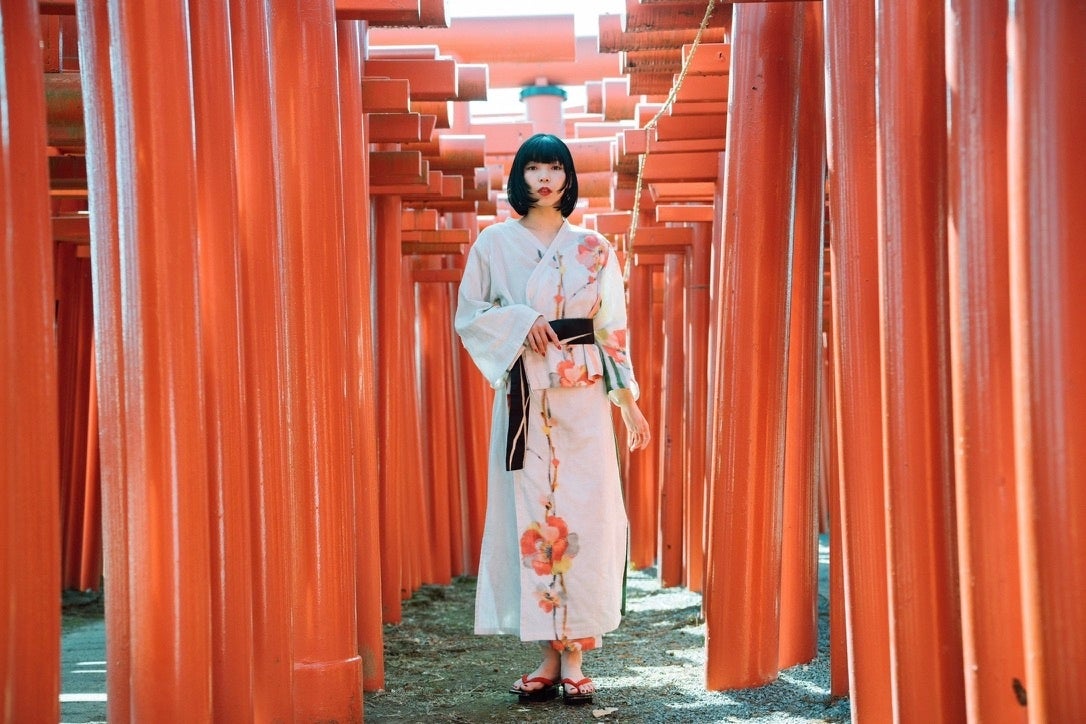 ピースを製作し、またプリント技術で銘仙の⼤胆な⾊使いを再現したセパレート浴⾐などを⽣み出しました