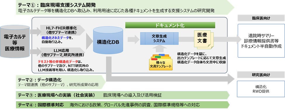 目標:LLM等(他のサブテーマの研究成果及びNTT版LLM「tsuzumi」※2等)を活用し、非構造化データである電子カルテデータ(テキスト文章)等を構造化し、データベースへ取り込む。