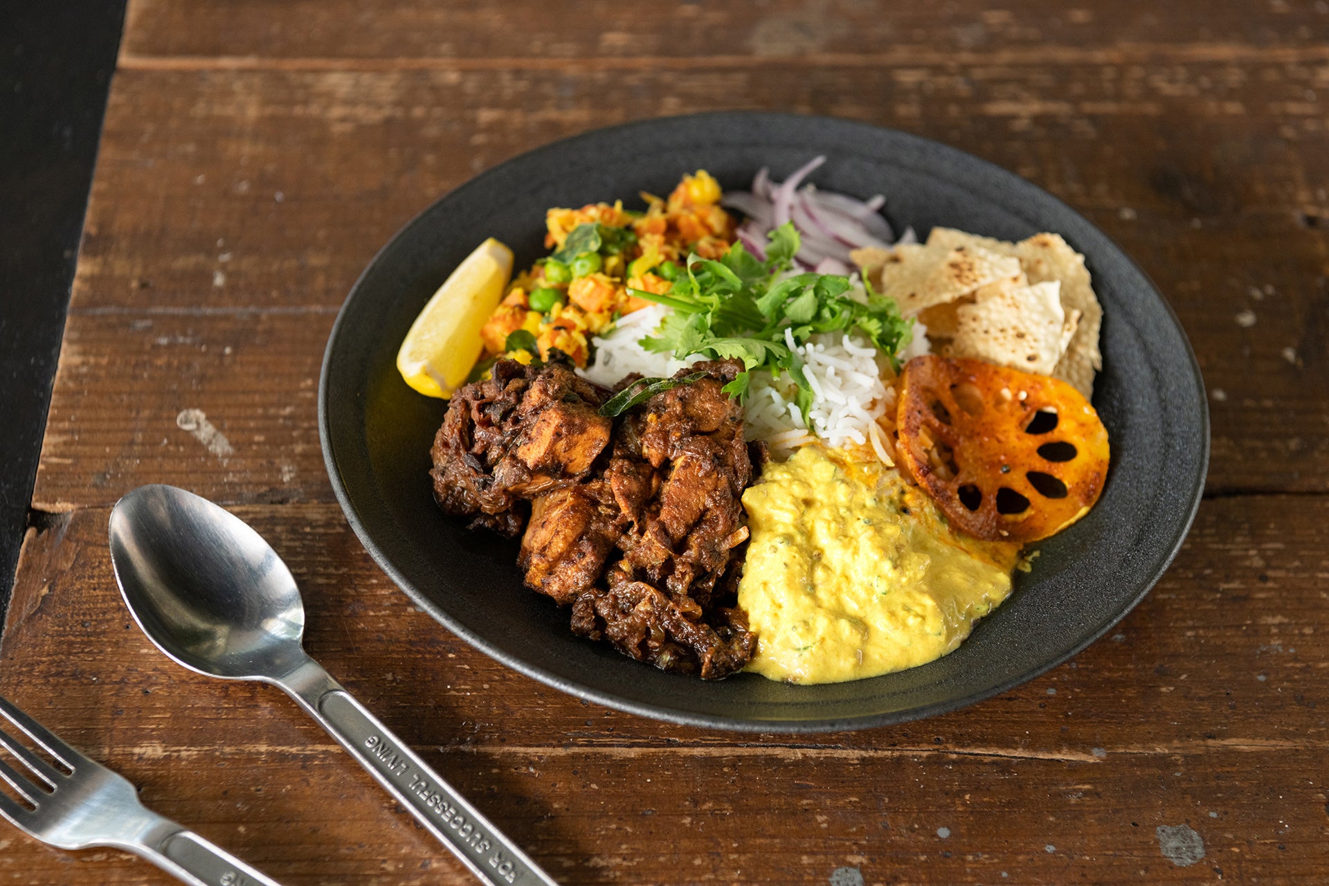 今回のコラボレーションメニューでまず目に入るのは、ゴロっとしたお肉が食べ応えある「チキンペッパーフライ」。ターメリック、チリ、パプリカ、コリアンダーパウダーなどの6種類のスパイスでマリネしたチキンをココナッツオイルやギーなどで炒め揚げした『ユニーダカリー』の名物メニューです。
