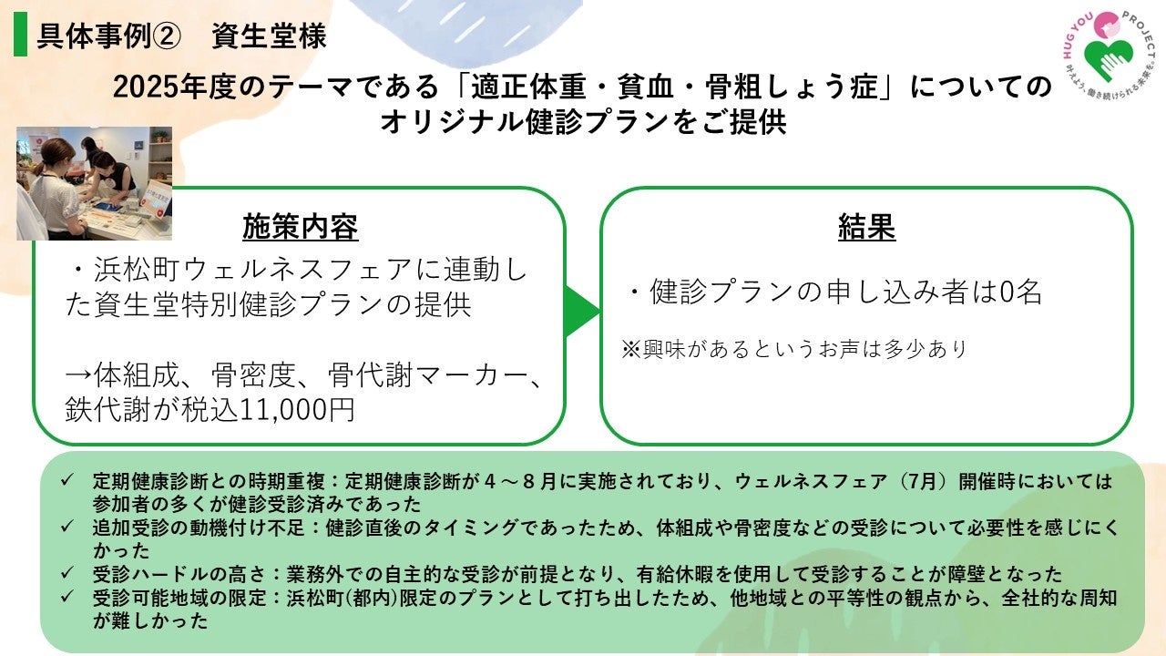 続いて、資生堂の保健師を担当している團野さんより、「資生堂が行っている女性の健康プロジェクトの2025年のテーマ(適正体重、貧血、骨粗しょう症)とコラボレーションする形で、クレアージュ東京で受診できる資生堂限定の特別健診プランを作成させていただきました。」と報告がありました。資生堂では、体組成や骨密度など企業健診では必須項目となる機会が少ない項目をセットにした特別プランの提供を実施したものの、アンドエスティHDと同様に申込数0件に終わる結果に。この結果に関して團野さんは、「7月に実施したためほとんどの社員が定期健診受診済みの状況だったことや、業務外で自主的に受診することが障壁となった可能性を考えています。また、都内限定プランとして打ち出したため、公平性の観点から周知が難しかったことも挙げられます。」とコメントしました。