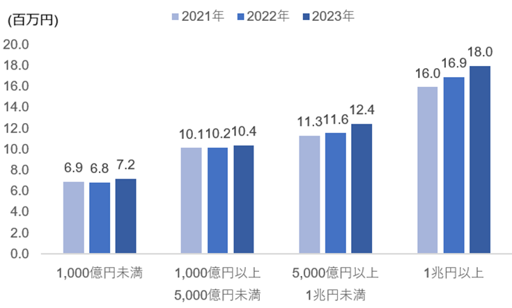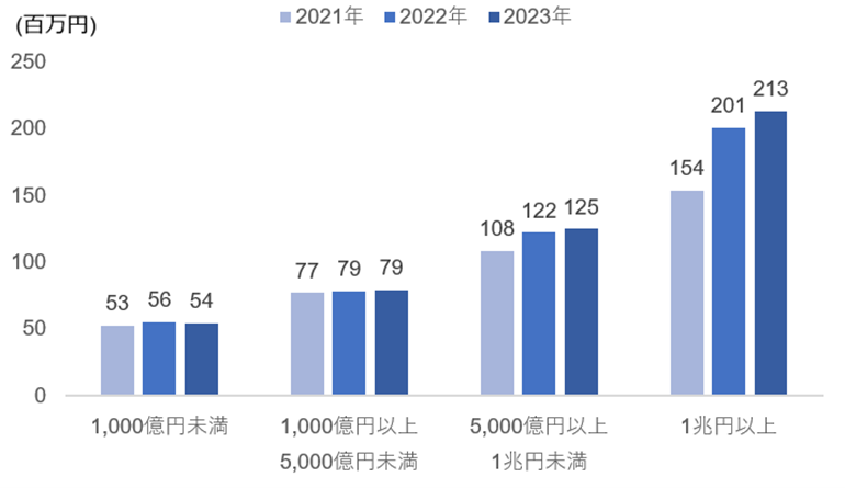 直近3年間連続して本サーベイに参加している企業群において、2023年の社長の総報酬額(中央値)は8,000万円でした。時価総額別(「1,000億円未満」、「1,000億円以上5,000億円未満」、「5,000億円以上1兆円未満」、「1兆円以上」の4つの企業群)の推移をみると、概ね総報酬額は増加傾向を示していました(図表1)。「1兆円以上」の企業群では2億1,328万円となっており、昨年比6.2%と最も増加していました。
