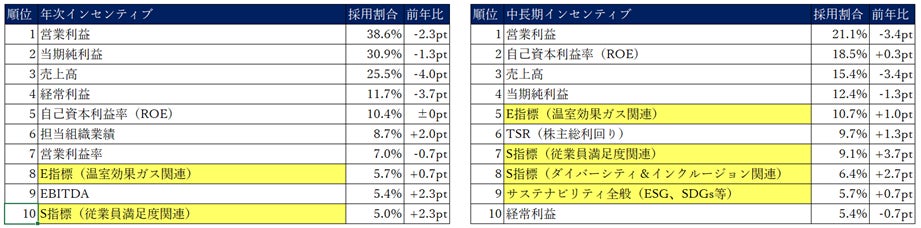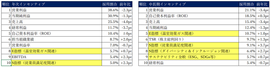 インセンティブ報酬制度の評価指標(KPI)では、年次インセンティブ、中長期インセンティブの双方でE(環境)指標「温室効果ガス関連」、S(社会)指標「従業員満足度関連」といった、比較的定量評価しやすい非財務指標の採用が増加。