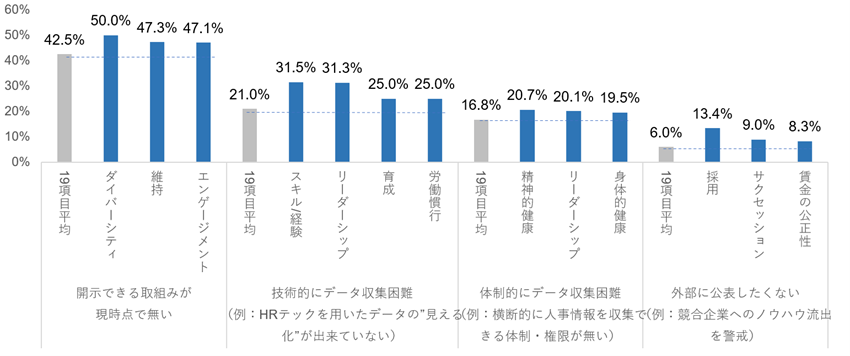 人的資本可視化指針で開示事項として示された19項目の開示状況について「検討中」または「開示予定なし」と回答した企業数は図表10のとおりです。これら企業を対象に開示していない理由を尋ねたところ、最も多かった理由は「開示できる取組みが現時点で無い」であり、19項目平均で42.5%を占めています(図表11)。「技術的にデータ収集困難」な指標には「スキル/経験」(31.5%)、「リーダーシップ」(31.3%)が上位となりました。また、「外部に公表したくない」指標は「採用」(13.4%)が最も多く、次いで「サクセッション」(9.0%)でした。