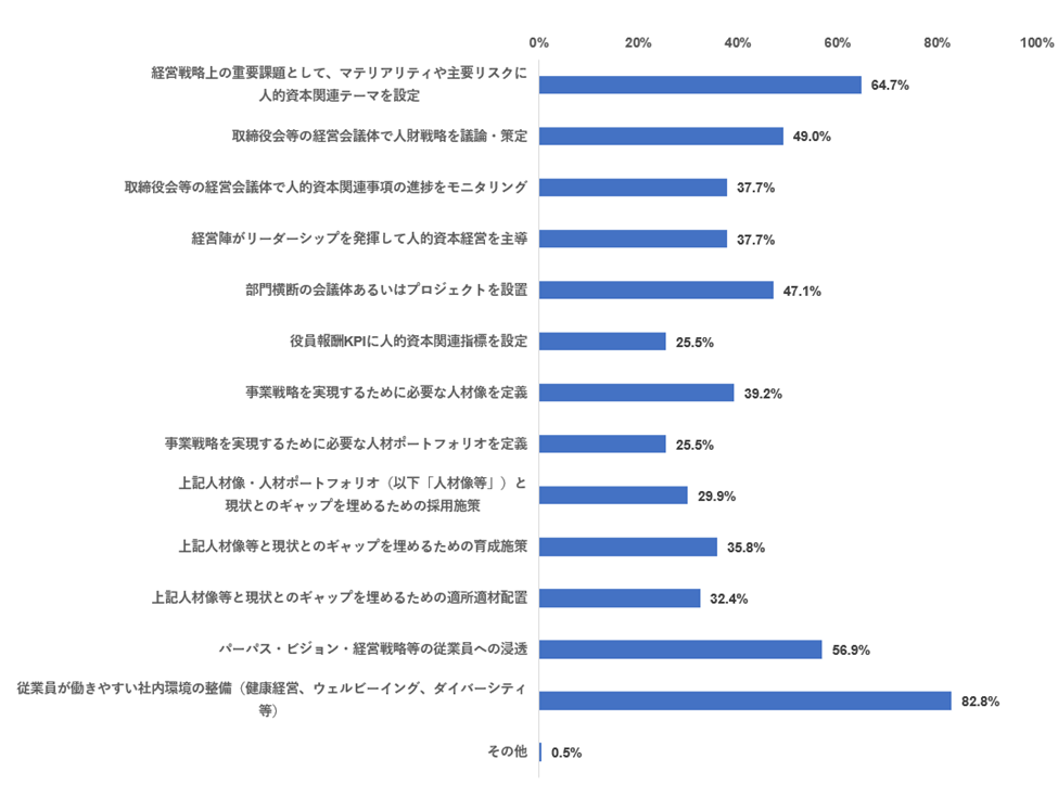 人的資本経営の取組み状況を、人材版伊藤レポートにおいて提唱されている「3P・5Fモデル」の3つの視点別にみたところ、昨年からいずれの視点でも進捗していました。その中の1視点である「経営戦略を人材戦略の連動」について、人材戦略を経営戦略に反映済および反映に向けて取組み中と回答した企業を対象に、その具体的な取組みについて集計したところ、6割以上(64.7%)の企業が「経営戦略上の重要課題として、マテリアリティや主要リスクに人的資本関連テーマを設定」していました(図表8)。一方で、取締役会等の会議体で人財戦略等の議論、モニタリングを行っている企業の割合は、それぞれ49.0%、37.7%でした。