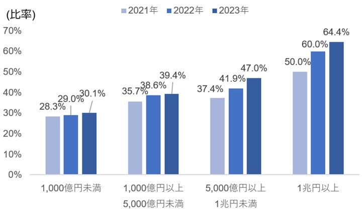 直近3年間(2021年~2023年)における社長の総報酬額(中央値)は概ね増加傾向。最も伸びが大きかったのは時価総額1兆円以上の企業群で、2億1,328万円(前年比 6.2%増)であった。また、変動報酬比率(総報酬に占める賞与等の年次インセンティブや株式報酬等の中長期インセンティブ報酬の割合)も継続的に増加し、1兆円企業群では64.4%(2021年比14.4pt増)と欧州企業の水準に肉薄。